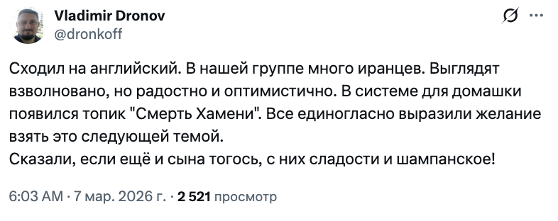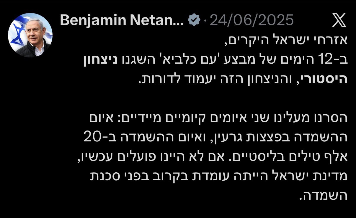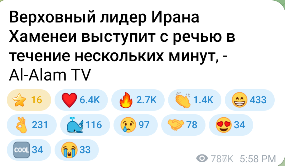 «Они стремились захватить и править Ближним Востоком. Это первый раз за тысячи лет, когда Иран проиграл соседним ближневосточным странам. Они сказали: «Спасибо, президент Трамп». Я ответил: «Пожалуйста!» Иран больше не «тиран Ближнего Востока», он, вместо этого, «проигравший Ближнего Востока» и будет им еще много десятилетий, пока не капитулирует или, что более вероятно, полностью не рухнет! Сегодня Иран получит очень сильный удар!»