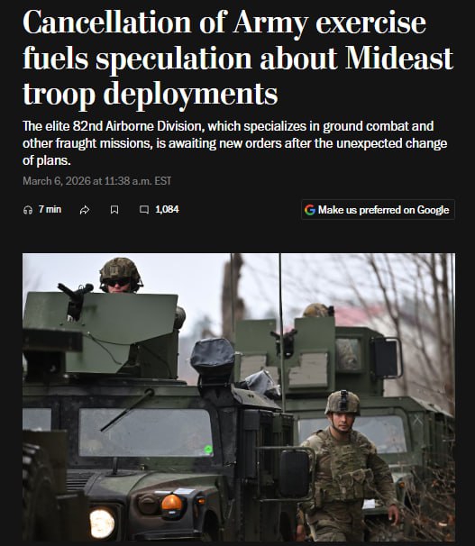 82-я воздушно-десантная дивизия США получила приказ начинать подготовку к наземному вторжению в Иран. США рассчитывают втянуть в наземную операцию курдов и Азербайджан. Без наземной операции смена режима в Иране уже признана невозможной. Быть добру!