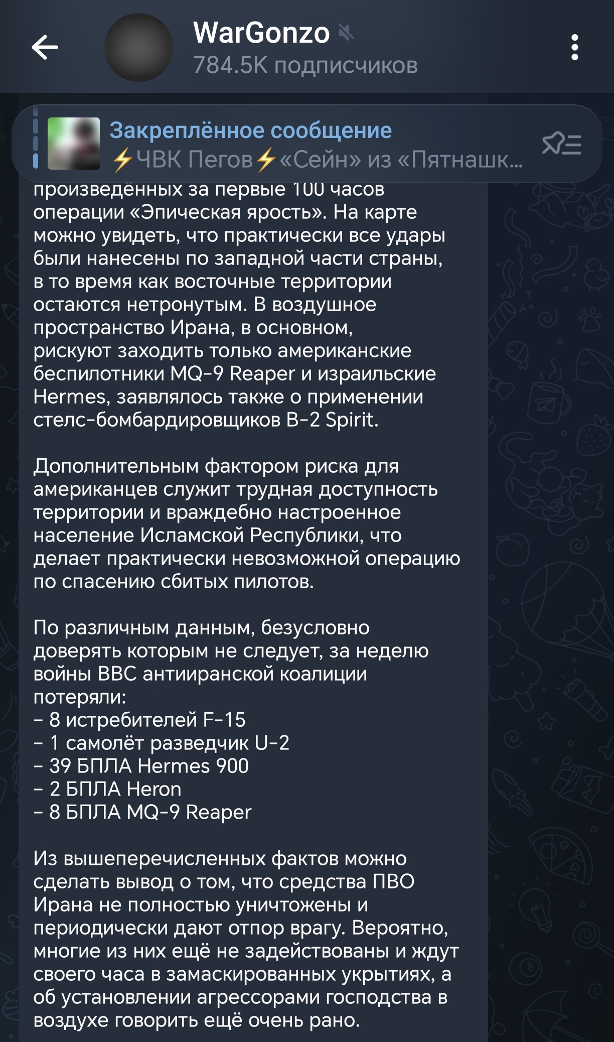 По различным данным, безусловно доверять которым не следует, за неделю войны ВВС антииранской коалиции потеряли: – 8 истребителей F-15 – 1 самолёт разведчик U-2 – 39 БПЛА Hermes 900 – 2 БПЛА Heron – 8 БПЛА MQ-9 Reaper