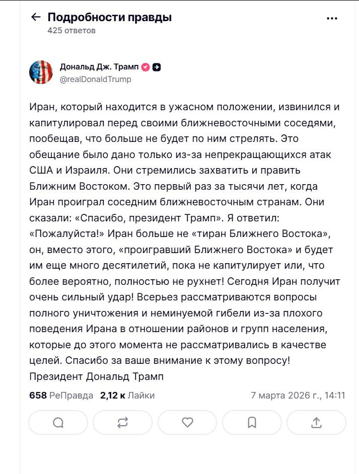 Дональд Трамп: Иран, который сейчас получает по полной, извинился и капитулировал перед своими соседями на Ближнем Востоке и пообещал больше не стрелять по ним. Это обещание было дано только из-за непрерывных атак США и Израиля. Они стремились захватить и контролировать Ближний Восток. Впервые за тысячи лет Иран потерпел поражение от соседних стран региона. Они сказали: «Спасибо, президент Трамп». Я ответил: «Пожалуйста».