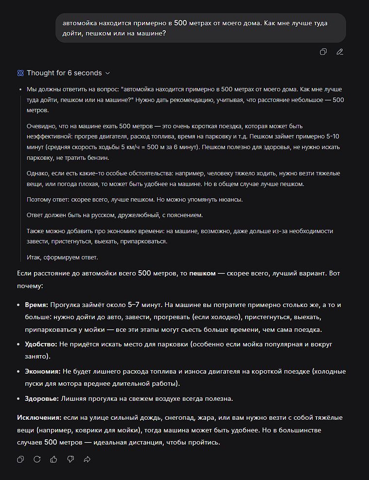 >>62074420 Ок. На пикриле ИИ действует абсолютно логично. Тебе надо попасть на автомойку. Ты не указал, что хочешь мыть машину, а именно тебе надо в конкретную точку. Ответ логичней чем у 99% людей, которые гыгыкая сказали бы че делать на автомойке без авто? И там начинаются варианты. Может ты сельдь и идешь нализануть волосатый онус Мехледу Кыбоеву за 600 рублей час. Пешком - быстрее и назад от говна проветришься.