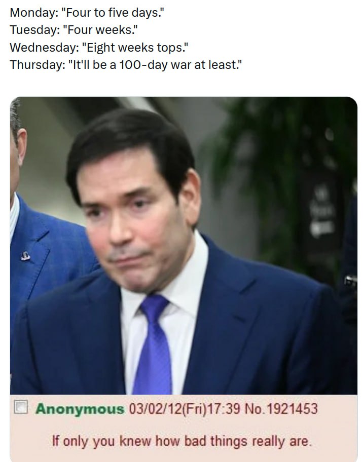 Я спрашивал на второй день конфликта, а какой эндгейм у рыжего дебила и респов? Ну то есть они добились высоких цен, шавки соскочили и надо делать мобку для наземки, иначе наебнут всех союзников. Это однозначно потеря парламента уже осенью, откат всех изменений, паралич Трампа, а дальше президент демократ который завозит еще 30 лямов нелегалов и респы уже никогда не побеждают на выборах.