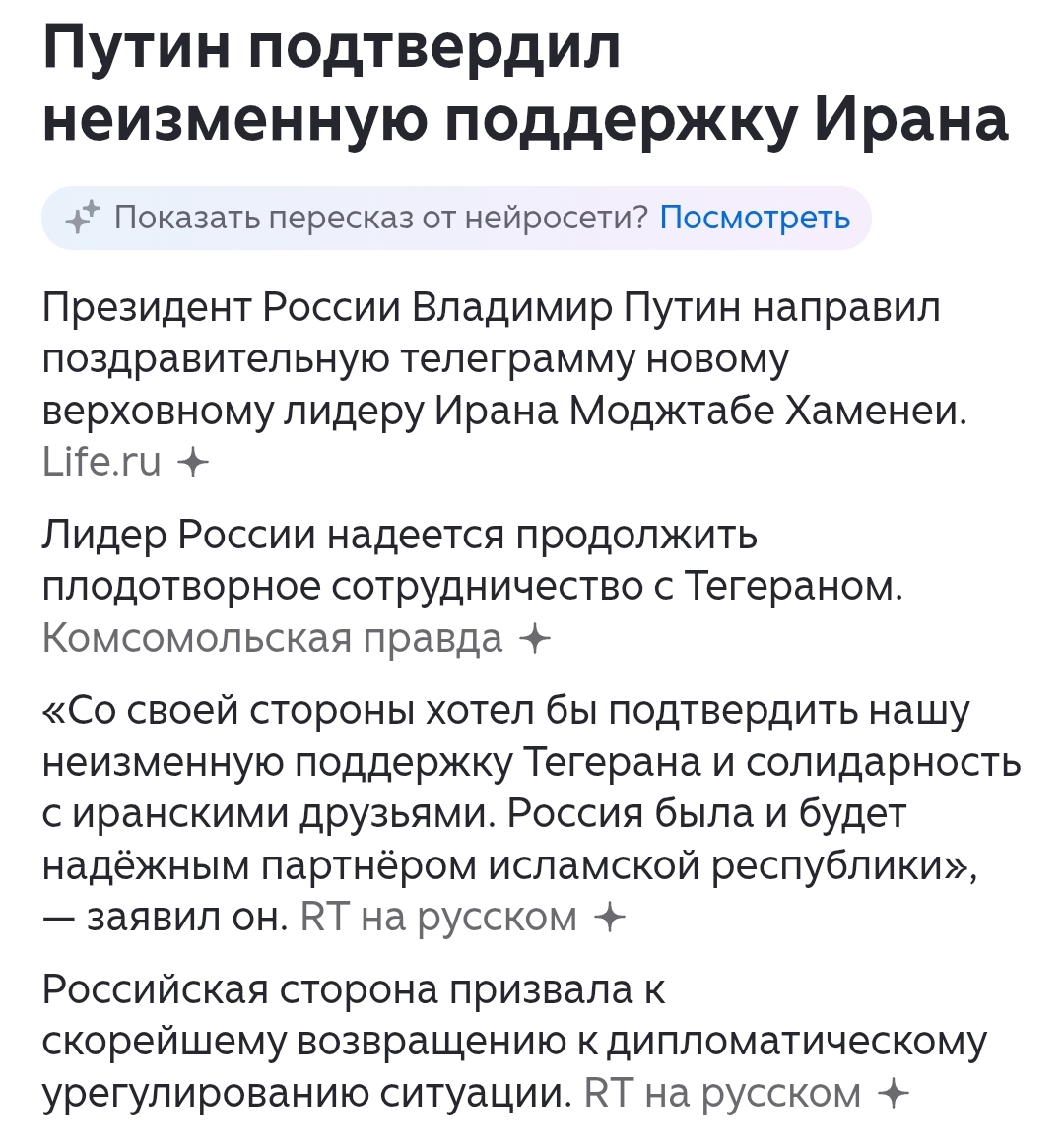 ⚡Путин поздравил Моджтаба Хаменеи с назначением новым лидером Ирана «Примите искренние поздравления по случаю Вашего избрания Верховным руководителем Исламской Республики Иран. Сейчас, когда Иран противостоит вооружённой агрессии, Ваша деятельность на этом высоком посту, несомненно, потребует большого мужества и самоотверженности. Уверен, что Вы с честью продолжите дело Вашего отца и сплотите иранский народ перед лицом суровых испытаний. Со своей стороны хотел бы подтвердить нашу неизменную поддержку Тегерана и солидарность с иранскими друзьями. Россия была и будет надёжным партнёром Исламской Республики. Желаю Вам успехов в решении стоящих перед Вами непростых задач, а также крепкого здоровья и силы духа», — опубликовано на сайте президента РФ.