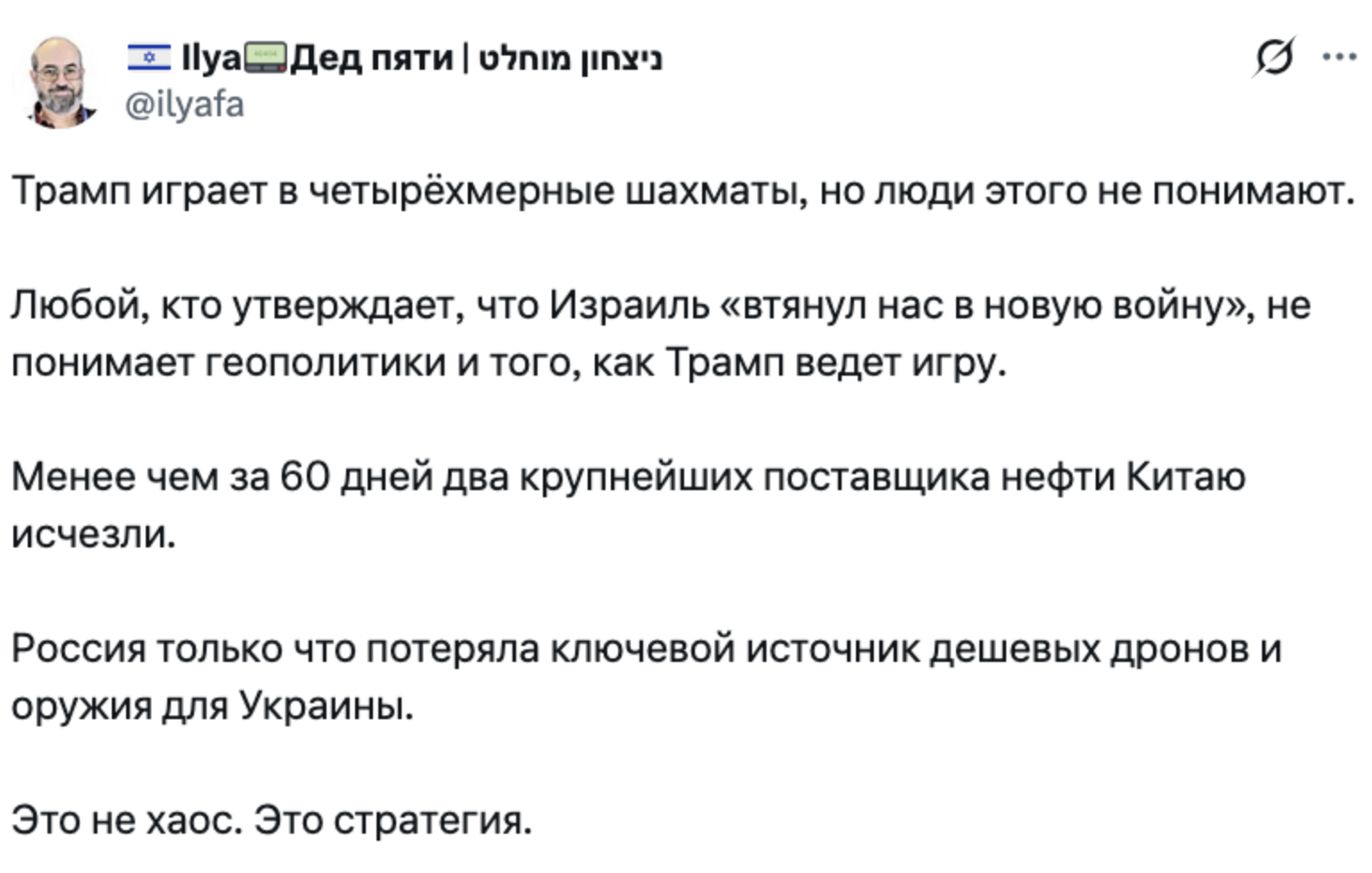 Трамп проиграл войну. Разнес регион. Теперь как маньяк попытается нанести максимальный ущерб без всякого смысла. Каждый следующий день продолжения конфликта, ухудшает положение сша.