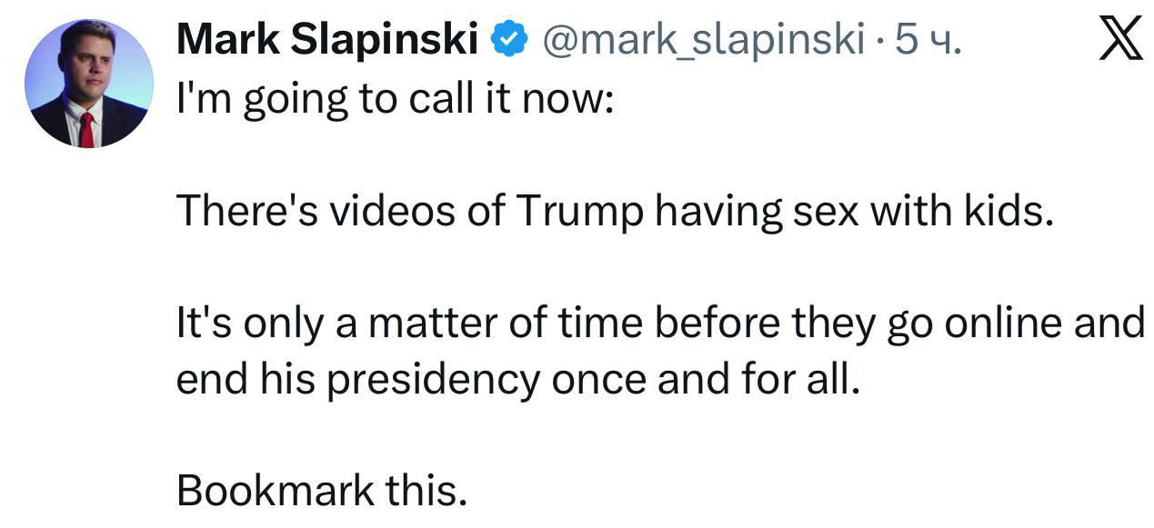 «Есть видео, на которых Трамп занимается сексом с детьми. Это только вопрос времени, когда они появятся в сети и положат конец его президентству раз и навсегда. Запомните это.» - канадский журналист Слапинский.