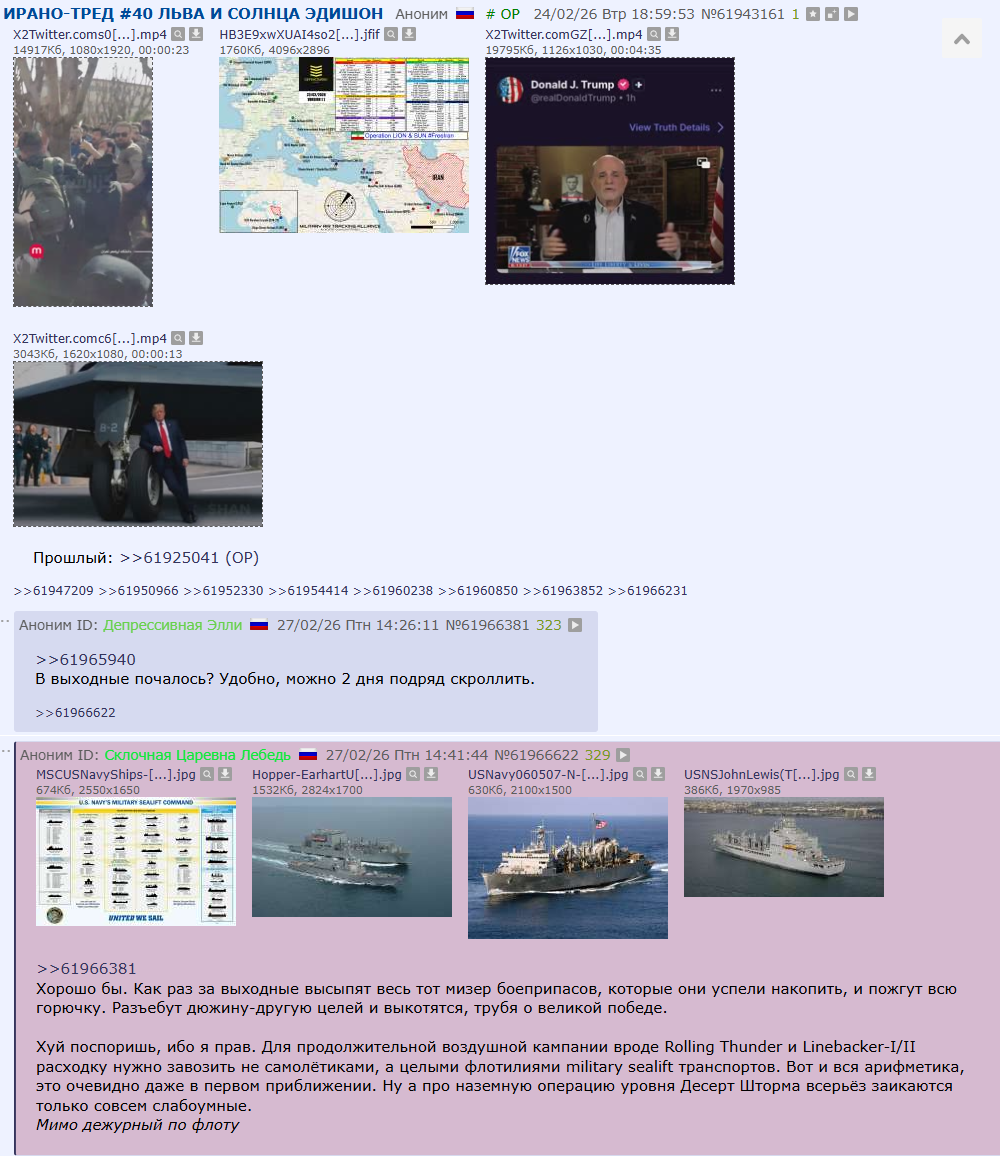 >>62086627 (OP) Возвращаюсь после перерыва. Итак, котятки, пока что всё сбывается В ТОЧНОСТИ как я говорил. Те силы, которые были стянуты в регион, оказались достаточны только для того, чтобы поддерживать удары высокой интенсивности в течение лишь очень короткого промежутка времени. Никакой стратегической, хотя бы просто систематической ёбки дырана уровня операций времён Вьетнама не наблюдается даже близко. Наземкой даже не пахнет, иранские бурундуки не восстали (что конечно, максимально прискорбно), но что самое печальное - никто не оказывает им реальной поддержки. Их могли уже 10 раз завалить оружием и боеприпасами, но вместо этого вся поддержка ограничивается только ретвитами и губошлёпством "берите власть в свои руки, мням" - и ясен хуй у них при таком раскладе нет желания идти на пулемёты, вооружившись табуретками.