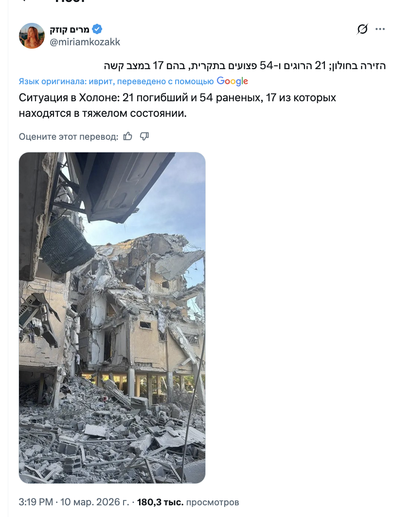 «Здание в Холоне, поврежденное баллистической ракетой из Ирана, 19 июня 2025 года»