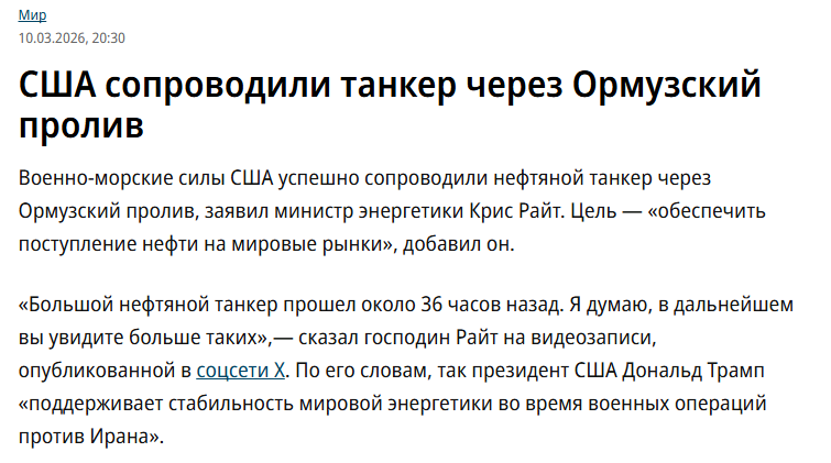 🔸Это произошло после того, министр энергетики США Крис Райт в своем посте заявил о сопровождении американскими ВМС танкера через Ормузский пролив, однако позже удалил эту публикацию.