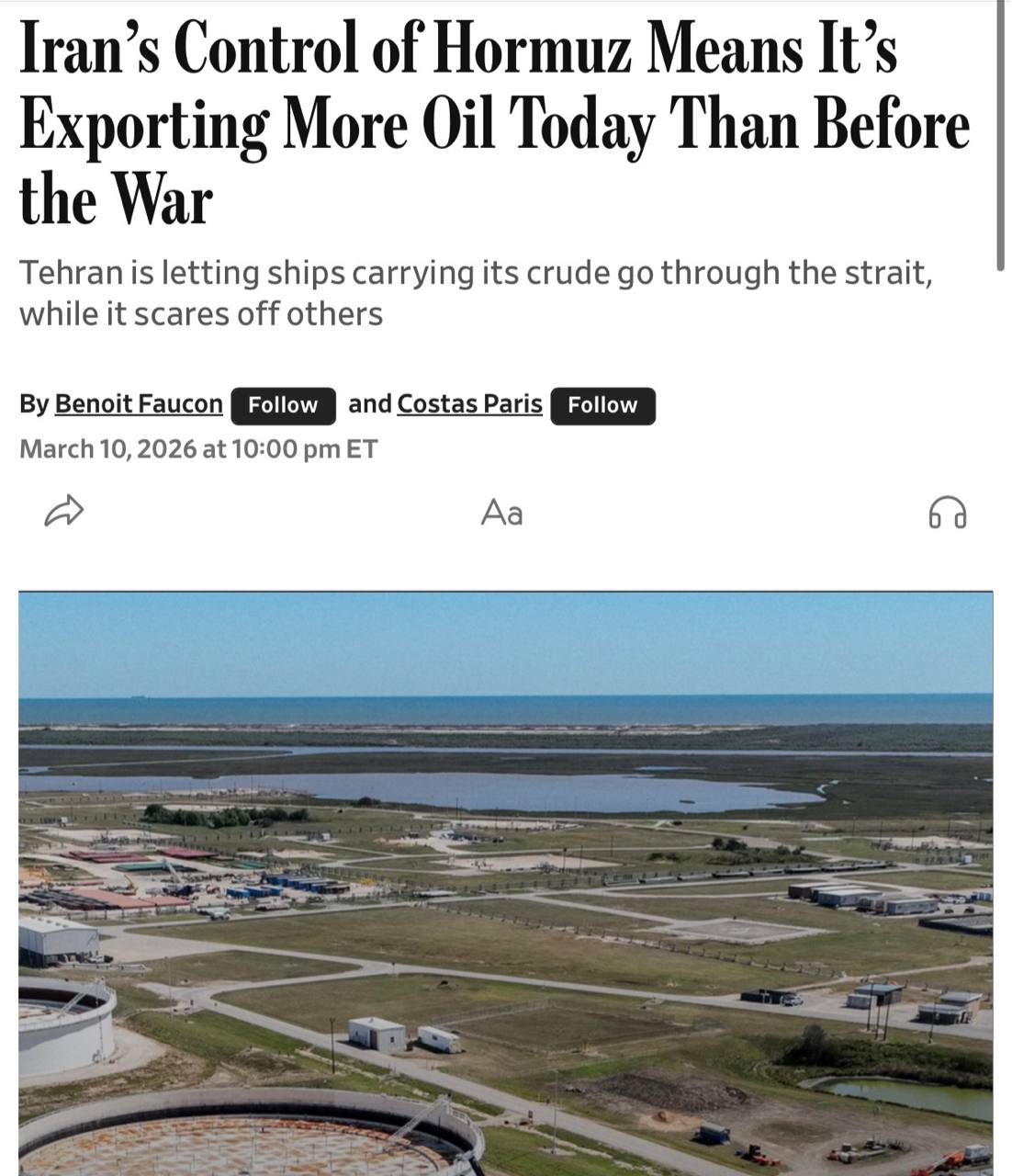 Почему спустя неделю "невероятно мощных обстрелов" Иран все еще блокирует пролив и отвечает обстрелами по Израилю и военным базам США? У Трампа там точно все "по плану"? Нефть делает ту зе мун, Шахеды хуярят по союзникам США и внятного противодействия им нет, Режим в Иране после смерти лидера только окреп и намеков на шатание нет.
