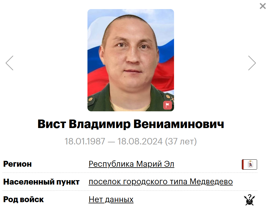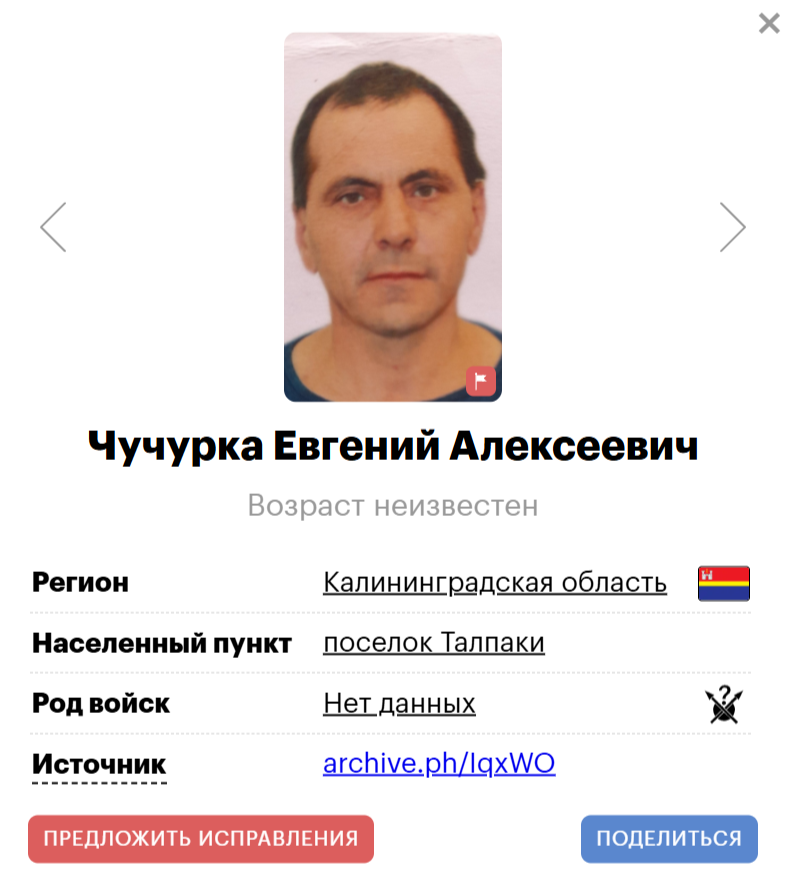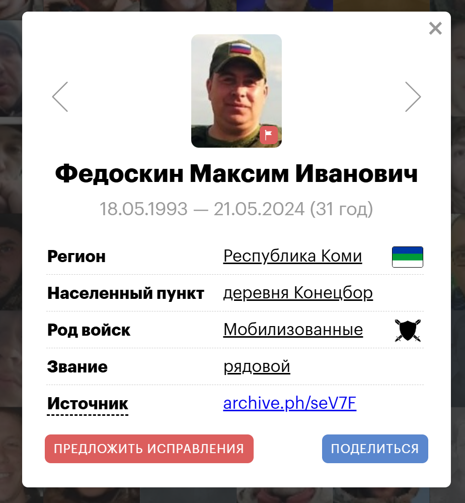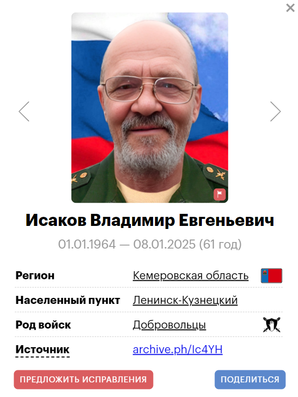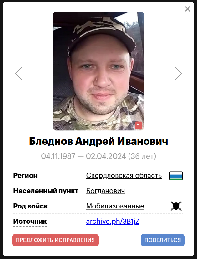 >>62103071 (OP) Из прошлого треда. Дважды подсчитали одного и того же человека с одной и той же фотографией, с одними и теми же годами рождения и смерти, с теми же ФИО (единственное, что ошиблись в отчестве). Подсчёт делал Майкл Наки с его теорией удвоенного времени? Тогда неудивительно, почему насчитали 200 тысяч. Проверяйте другие регионы, там может быть один и тот же человек по 2-3 раза указан, особенно без фоток. А ещё один и тот же человек может фигурировать в разных районах. Например, родился в Питере, служил в Североморске, подписал контракт от Москвы. И вот у нас уже 3 человека, которых на самом деле 1.