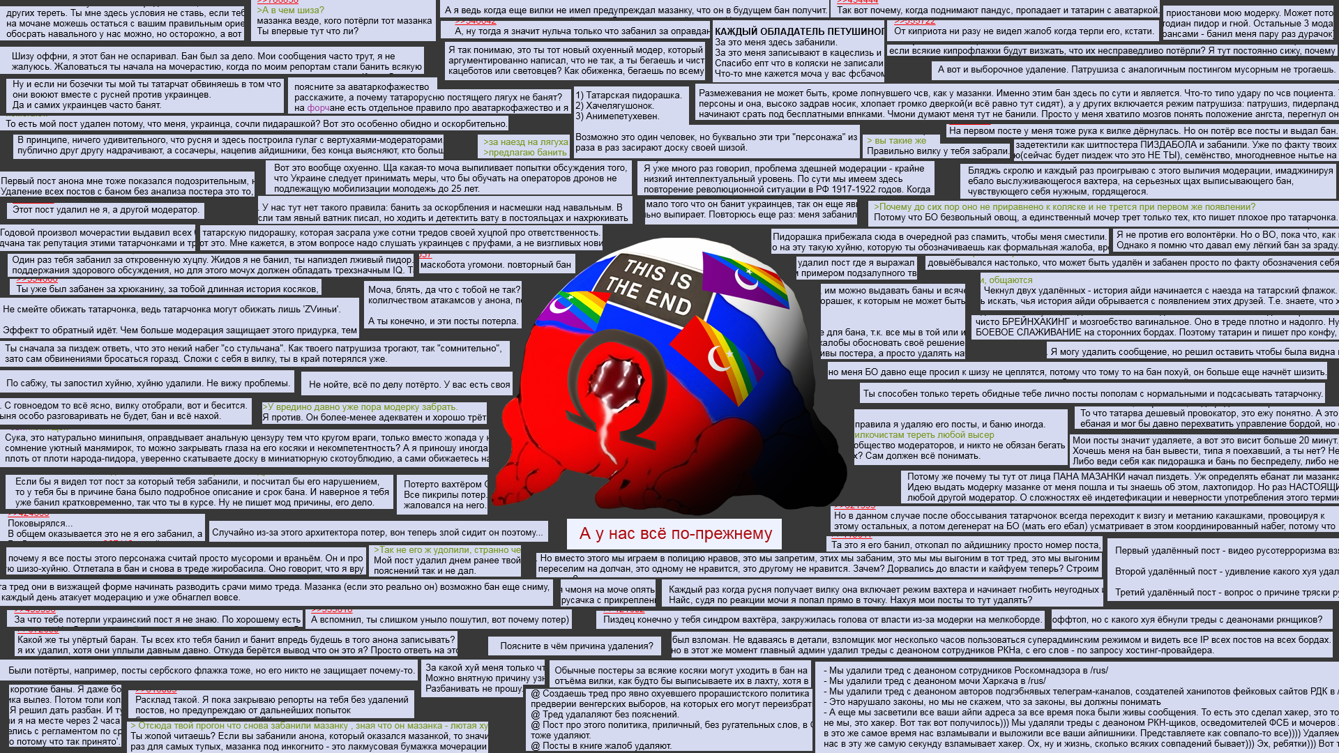 Написал в треде про мобильный интернет, что проблема ckотоублюдии (уkраины) в том, что она огромная и nидоpашки (xоxлы) не в курсе что творится в соседних регионах пока их медленно варят а потом рякают зашо нам списки белые. Словил два бана, посты автоматом потёрлись. Вообщем нейроКарина работает или хз что. Но у макакича пригорело от уточнений в (скобочках). Ну и как теперь иронизировать на этой подзалупной патрулируемой борде?
