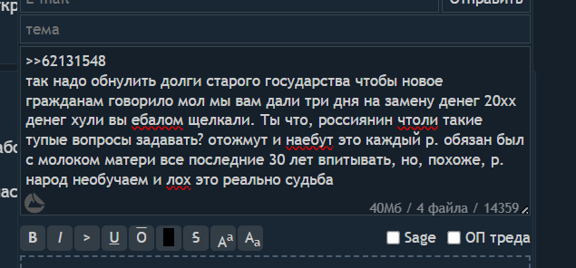 Вообще, анончики. Там бухтеж поднялся на счёт вкладов опять, уже на уровне едропидорасов. Если у кого-то ещё деньги там лежат, советую переводить в человеческую валюту или наличку хотя бы. Не ждите, сегодняшний вечер это звоночек по проводному телефону в кабинет обосранной моли.