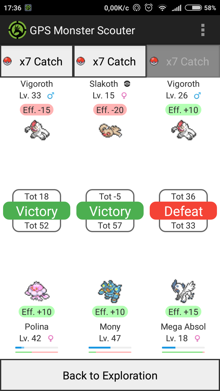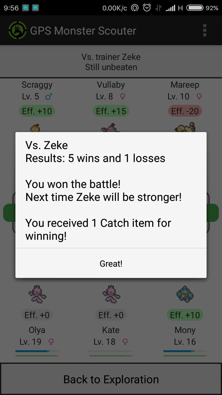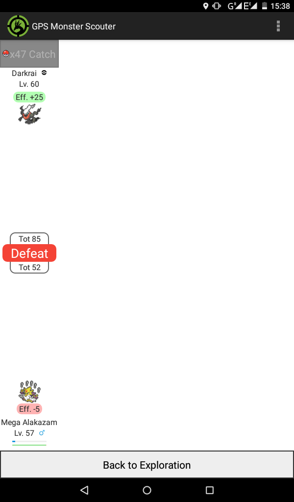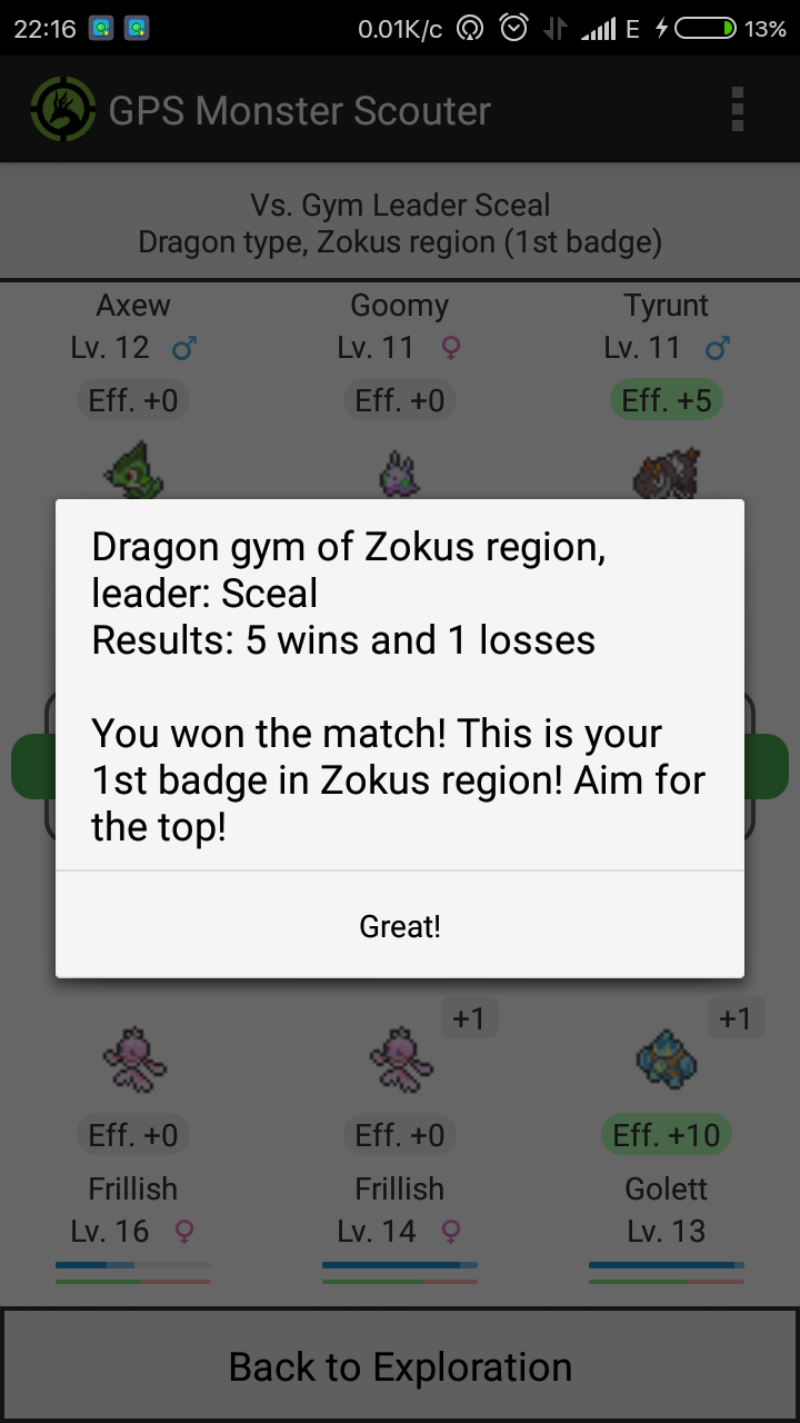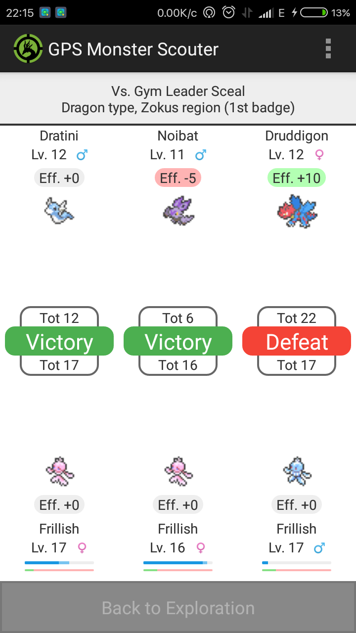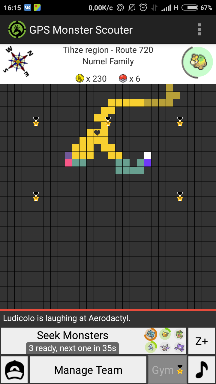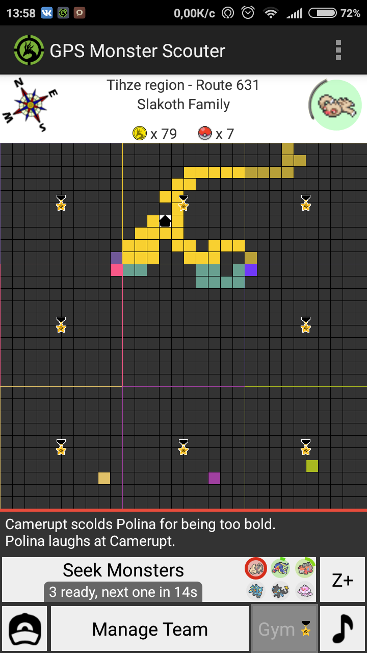 Решил завоевать последний квадрат 5 на 5 км. Там многоуровневый бой, но я уже догадывался об этом по скринам выше. Промучался с Дарк типом, т.к. у них там большой бонус против моих призрачков.