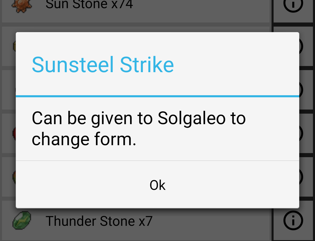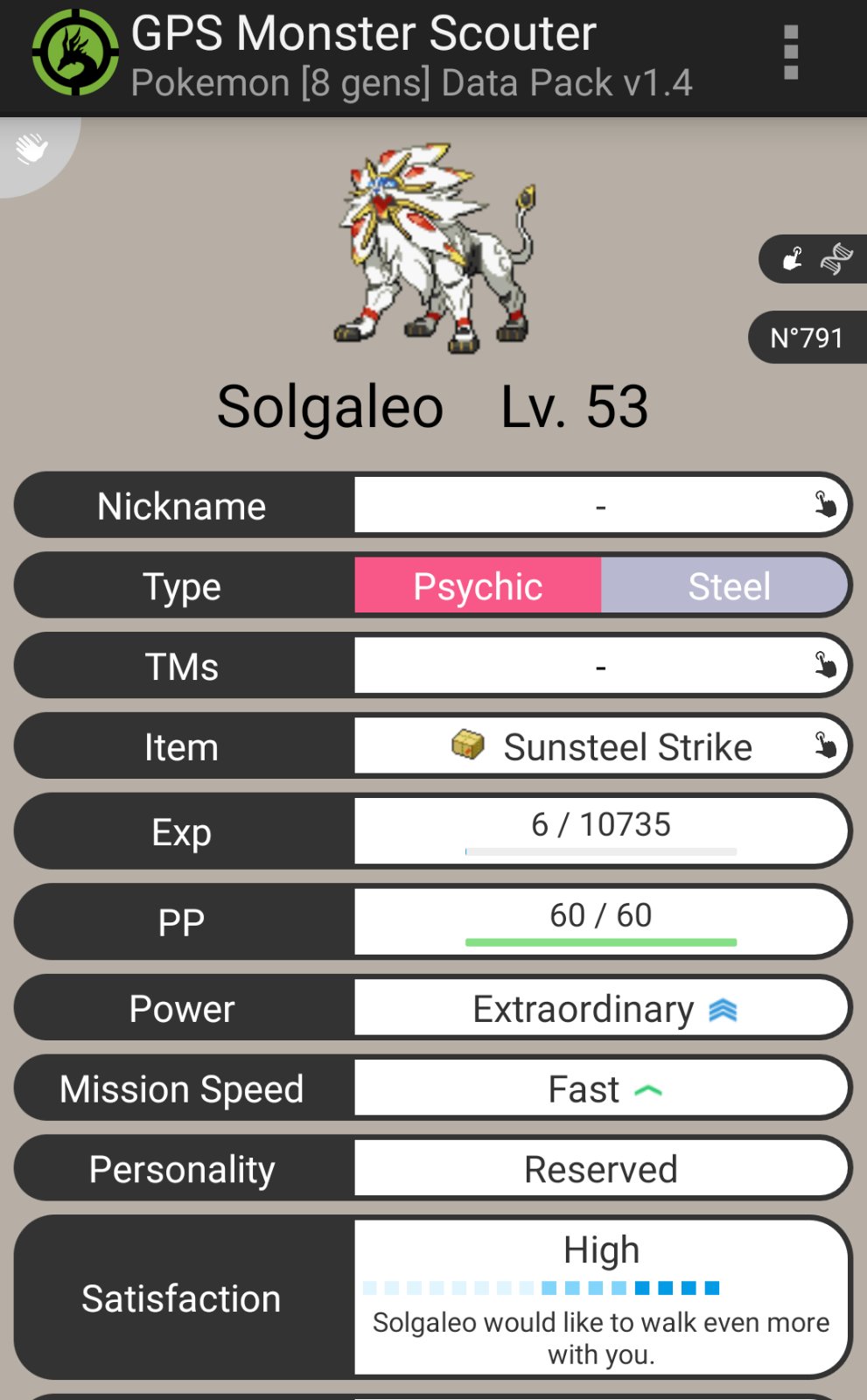 >>68705 Ломающие новости! Сегодня выбил с рядового покемона пикрил. Выяснил, что в этого Solgaleo эволюционирует Cosmog, который водится в квадрате, где и был выбит этот санстил страйк. Что даёт основание предположить, что айтемы для эволюции легендарных покемонов добываются с обычных покемонов, которые обитают в одном квадрате с нужным легендарным покемонов. Нужно поймать космога и посмотреть, как он будет взаимодействовать с предметом. Буду держать в курсе.