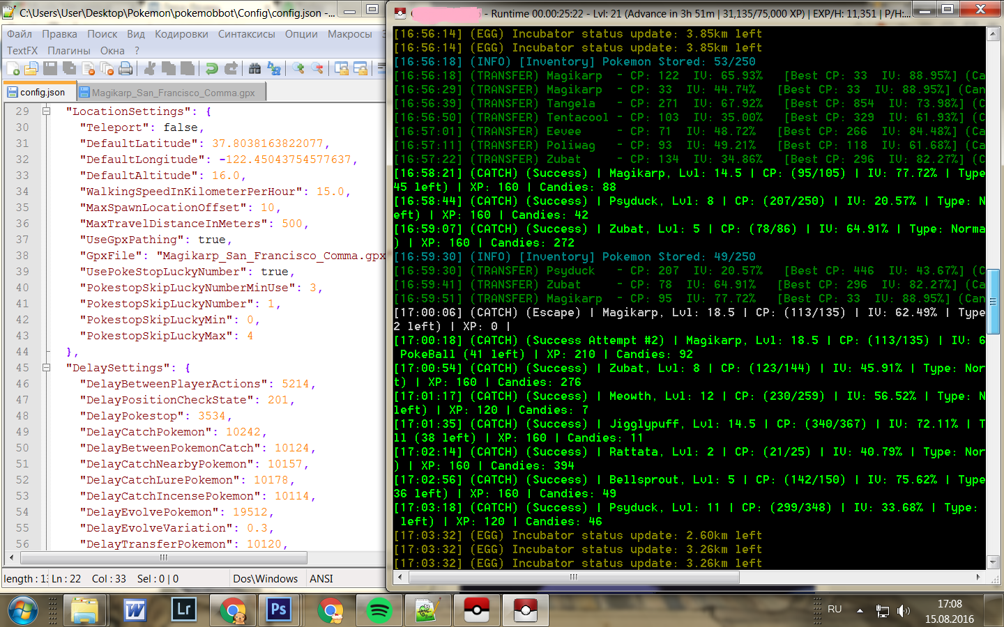 >>61853 У меня делэи по 200 стоят, пока не огребаю вроде. Скорость 15, точка спавна - централ парк. В нот ту трансфер внес червей, пиджей всяких. Копятся до 150, потом эволвятся под яйцом. Бот проработал почти сутки, потом не видел покестопов в округе, было похоже на айпи бан. Перезапустил через пару часов, поставил дальше фармиться. Скорость около 15-20к в час. Спасибо за скриншот, да за инфу