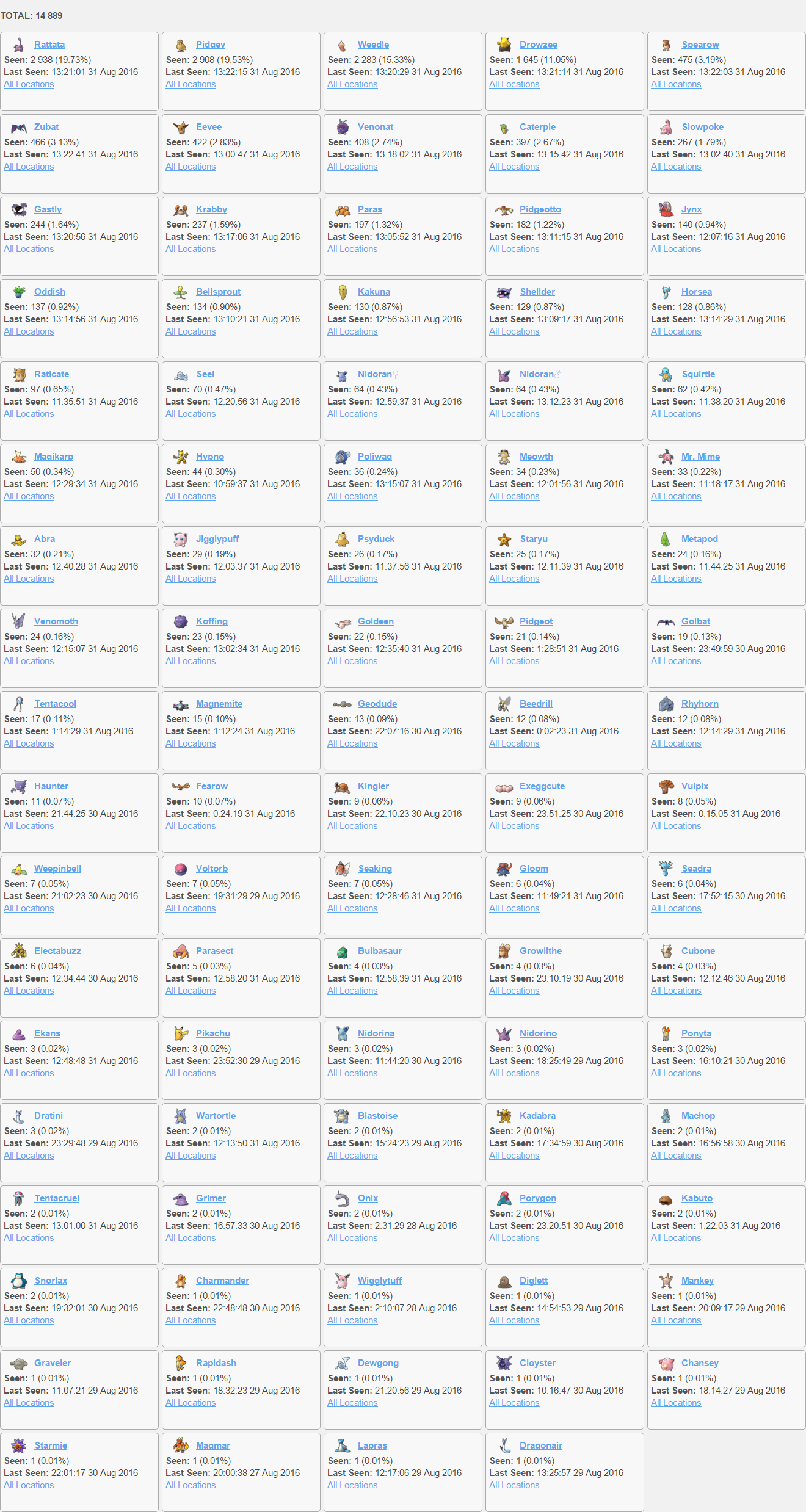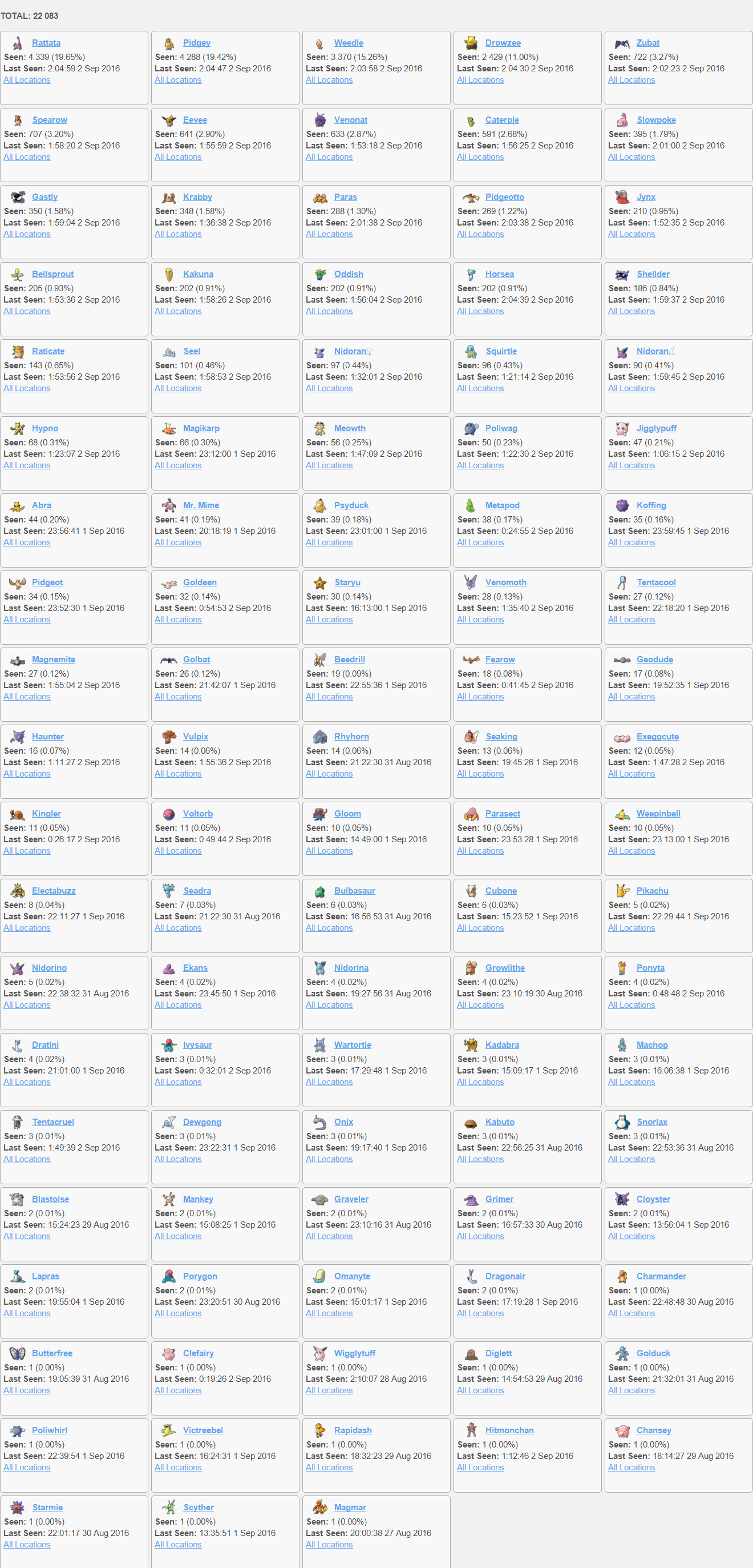 Живу в областном мухосранскоцентре на 200к населения. Имеем крыс, голубей, ивиков, червей-пидоров да дроузей. Изредка попадается что-то вроде нидоранов, карпов, шеллдеров и прочей водной фауны. Дважды упускал абру, поландболлы, с трудом отыскал магнемайта. А вчера был в гостях в соседнем городке у моря на 40к населения. Моментально отжал слоупока, волторба и сразу же электрода, палил пониту батарея разрядилась блядь и много чего еще. Как ниантики распределяли спаун - хер их знает.