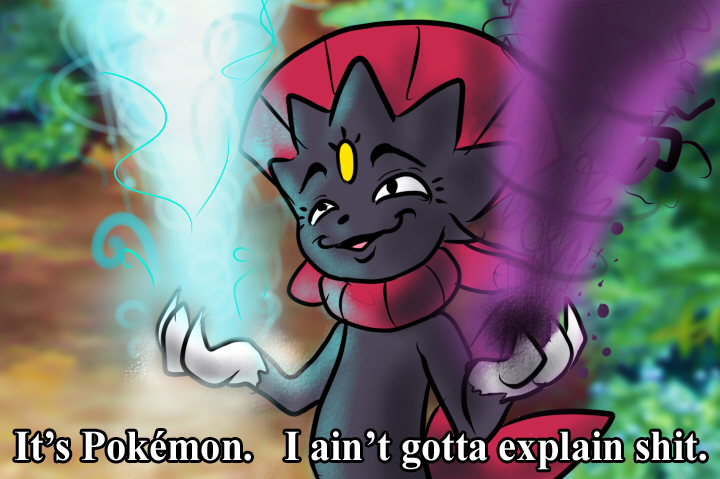 Алсо, на секундочку, каким бы способом покемоны не размножались - это не половой акт в обычном его представлении. Какого бы типа, размера и концепции покемон не был, своё потомство он оставляет в виде яйца. Иногда по размерам большего, чем та особь, которая могла его оставить. В ранних версиях покемоны типа "вылуплялись" из яйца, но в поздних версиях игры и аниме это стало выглядеть по факту как эволюция. Так что я не уверен даже есть ли у антропоморфных, да и не только, покемонов какие-либо половые органы. inb4 rule34