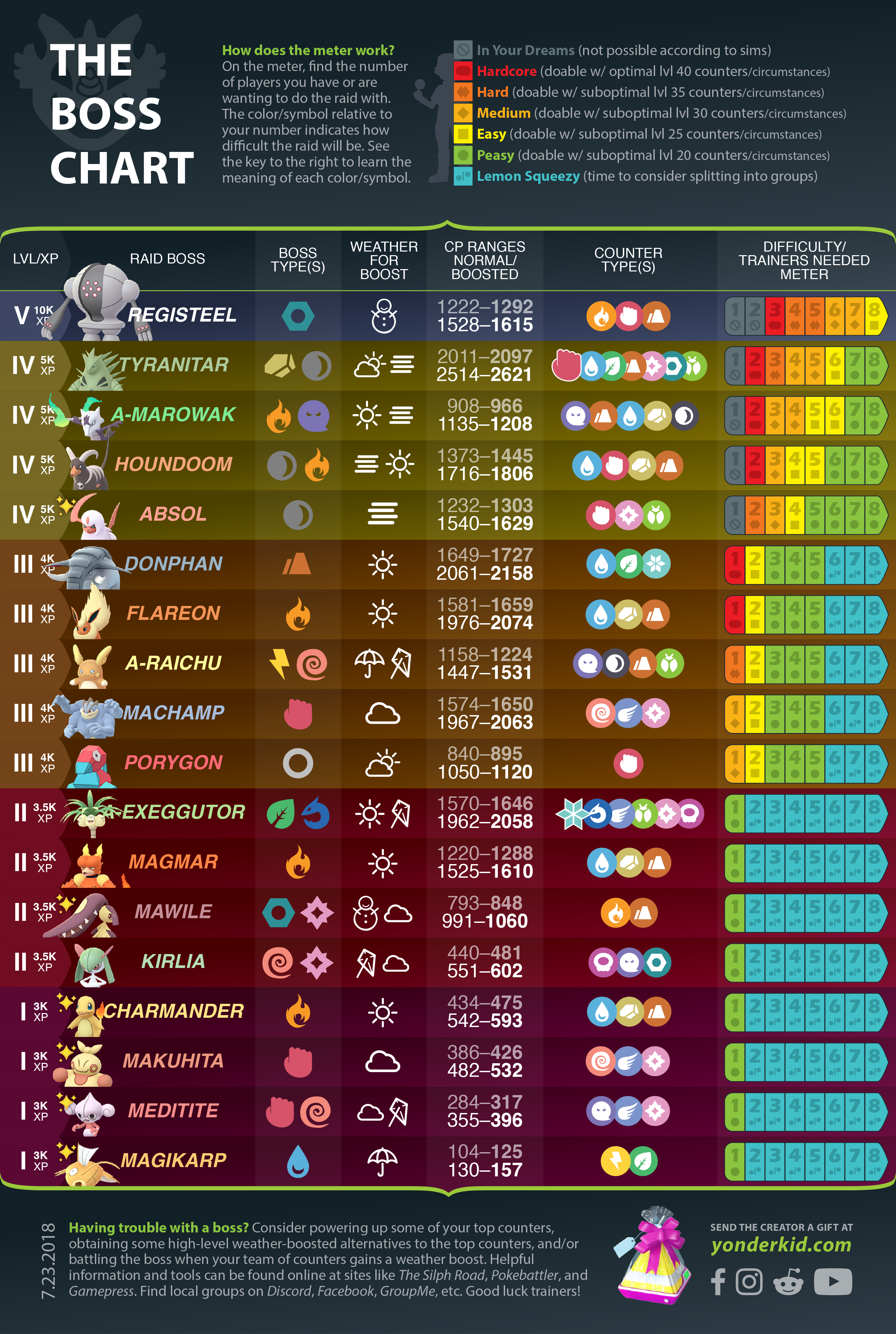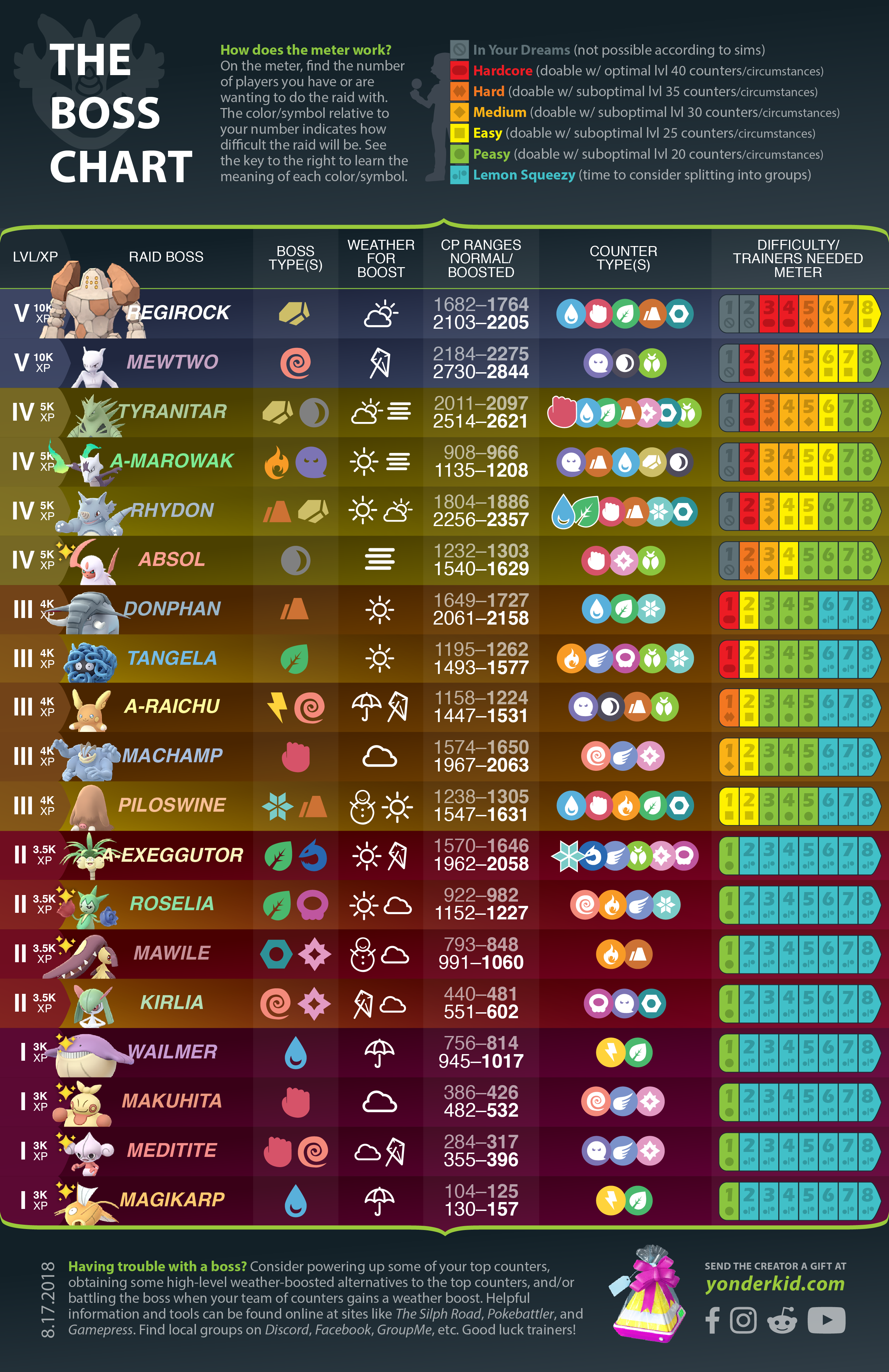 >>68649 > 1. В эвенте на Запдоса 21 надо будет убить босса какого уровня? Я не могу пока убить 3, 2ой легко. Как быть? Где искать людей? Пятого уровня, в соло их никак не осилишь, ищи чат твоего города, есть в телеге специальный бот, называется dratini bot > 2. Крученый грейт лучше чем простой экселент? Есть бонус на поимку если бросок крученый или только чисто экспа? Крученый в любом случае лучше, лучше кидать крученый экселленты, особенно если лег ловишь. Но если сложно ограничивался крученый грейтами. И качество броска, и то что он крученый повышают шанс поимки. Также повышают шанс медали по типам покемонов, чем лучше медаль тем сильнее она повышает шансы. То есть идеальный вариант это золотая медаль за поимку нужного типа покемона, золотая малина и крученый экселлент > 3. Саммер эвент дает шайни пикачу в очках? Шайников не завезли, увы