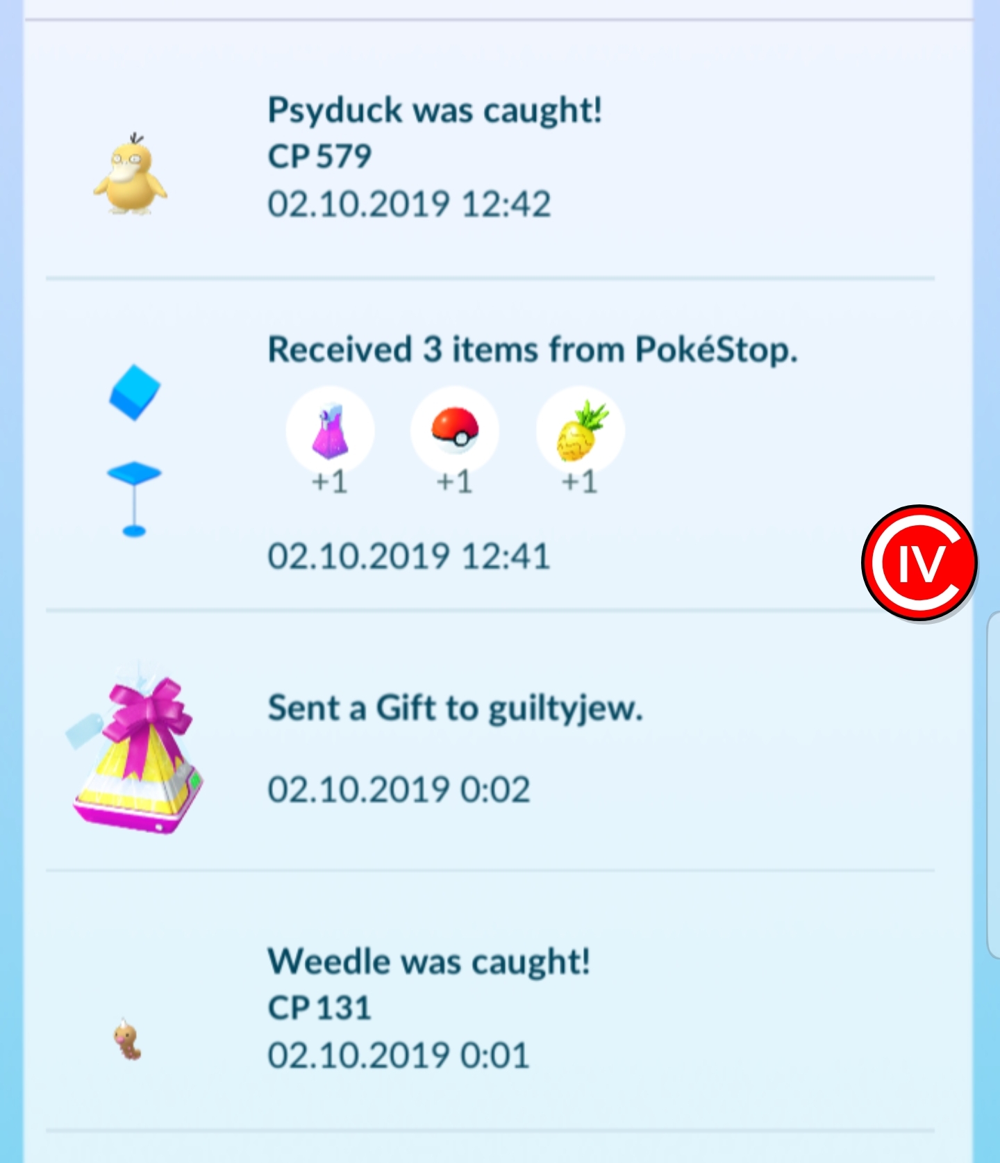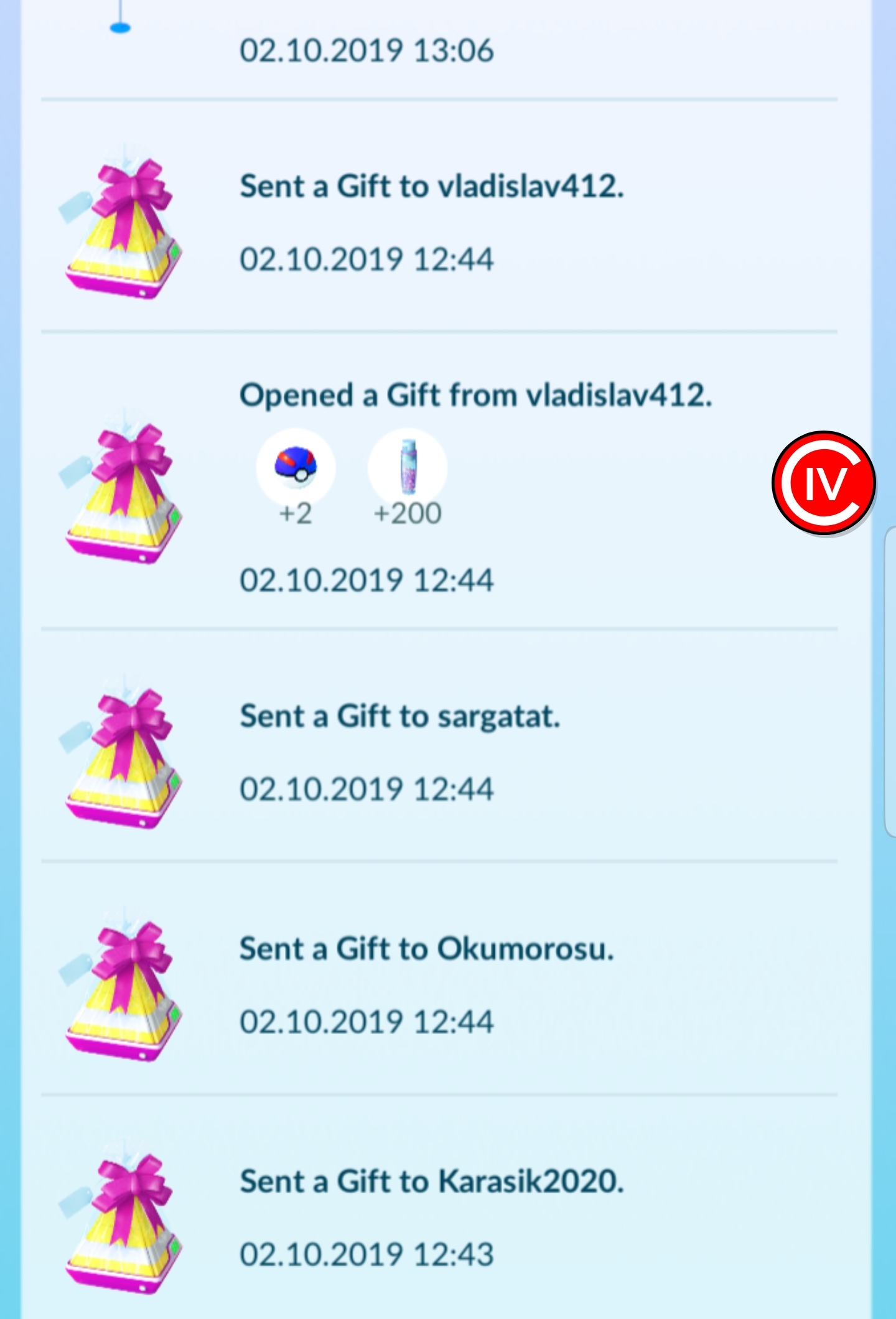 Чуваки, тут всю неделю работа и простуда, так что гифтов вам не накрутил. Да и просто каждый день отправлять не смогу - вас скопилось дохуищи реально, а у меня по пути на работу всего три покестопа и арена, причём один я всё никак не могу крутануть из-за ебучей мёртвой зоны GPS. Скорее всего только на выходных смогу наотправлять всем. Хер знает, откуда вы их каждый день берёте.