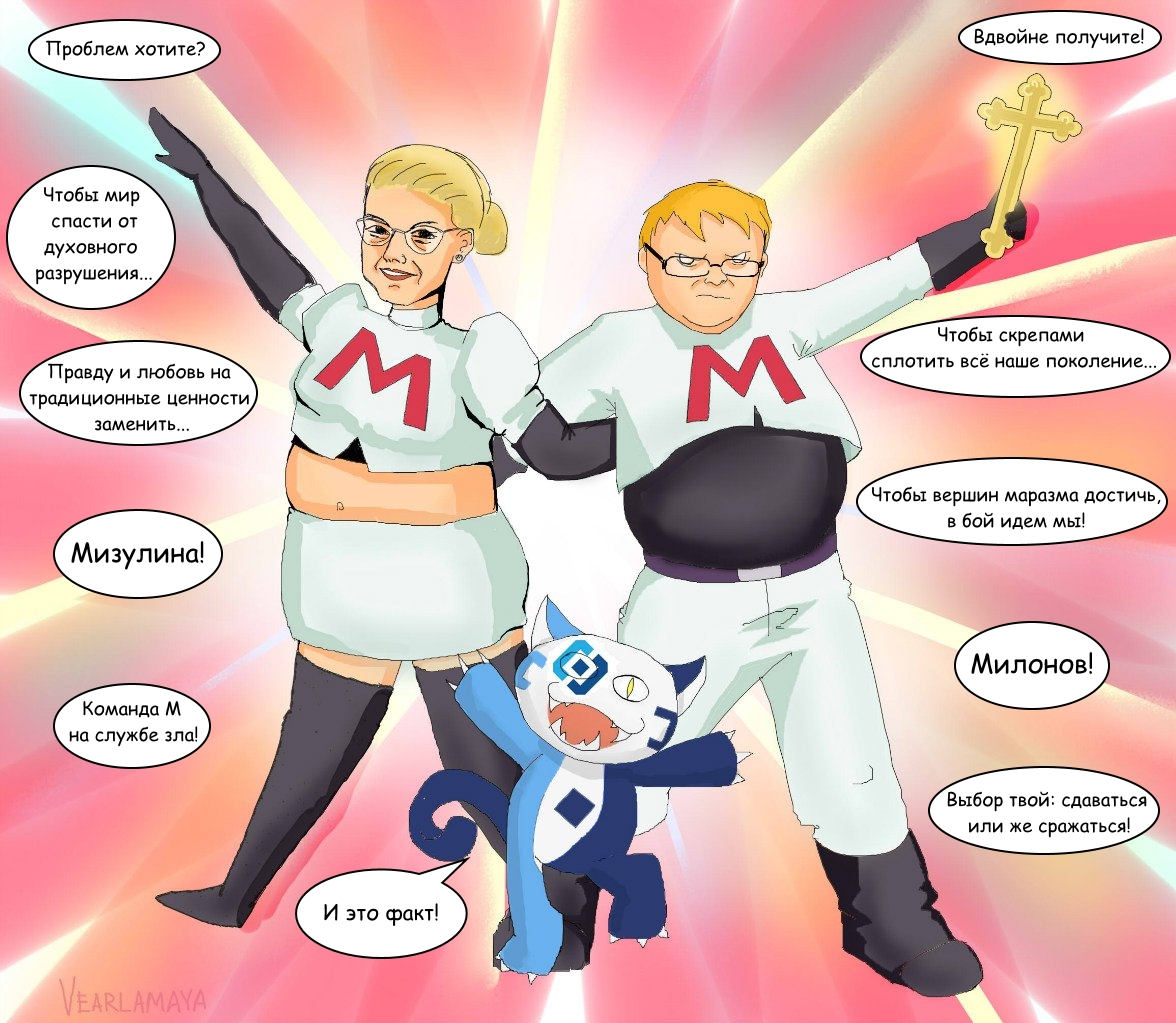 >>26291 Мизулина: Проблем хотите? Милонов: Вдвойне получите. Мизулина: Чтобы мир спасти от духовного разрушенья. Милонов: Чтобы скрепами сплотить всё наше поколенье. Мизулина: Правду и любовь на традиционные ценности заменить. Милонов: Чтоб вершин маразма достичь, в бой идём мы. Мизулина: Мизулина. Милонов: Милонов. Мизулина: Команда M на службе зла. Милонов: Выбор твой: сдаваться или же сражаться. Роскомнадзор: И это факт.