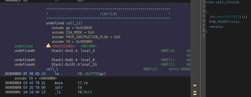 Пытаюсь гидрой реверсить бинарь со своего роутера, но очень быстро упираюсь в то, что происходит вызов функции по адресу 0 (на втором скрине инструкция по адресу 400860 читает ноль с адреса 0x410930 и пишет его в t9, а двумя инструкциями позже на этот нулевый t9 делается колл)