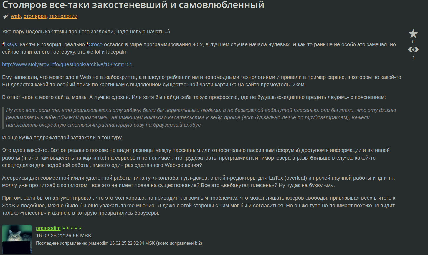 >>3404268 >Столяров навязывает определенное мировоззрение. >Занимается тем же, что и сам критикует, вплоть до призывов к расстрелам - индокринацией Это да. Он ведь либертарианец ещё. Я думаю, рано или поздно, он как Михаил Светов дойдёт до мысли что "Путин милосердный лидер и воплощение либертарианского будущего" Тем не менее, я не заметил чтобы в книге что-то навязывалось. В книге нет особо никакой пропаганды, кроме пары цитат пинуса торвальдса. >>В результате у его учеников с такими взглядами на IT будут серьезные проблемы при поиске работы. Как я уже сказал, не нужно в университетах учиться, нужно сразу искать работу. Вот этот человек правильно сказал >>3404250 Вот девопс у нас недавно прочитал Танненбаума. И знаешь отзыв девопса на эту книгу? "интересно - но не пригодилось нихуя". Вот так вот. Работа с кубернетисом - кнопкодавство для макак, как и большая часть айтишки. Учитесь тыкать по клавишам, а не навуку свою развивайте. >Столяров позиционирует свои книги как учебники для профессиональных программистов. Нет. Там написано "для начинающих" >Вообще он похож на нашего местного Анти-SETI-петуха с его рассуждениями о быдлопрогрессе и научных неорелигиях (и Мишаня, ЕМНИП, тоже либертарианец; там похоже, одни шизы со времен Новодворской). А мне отчасти такие темы нравятся. Хотя, безусловно многое что там просто бред, особенно по части либертарианства.