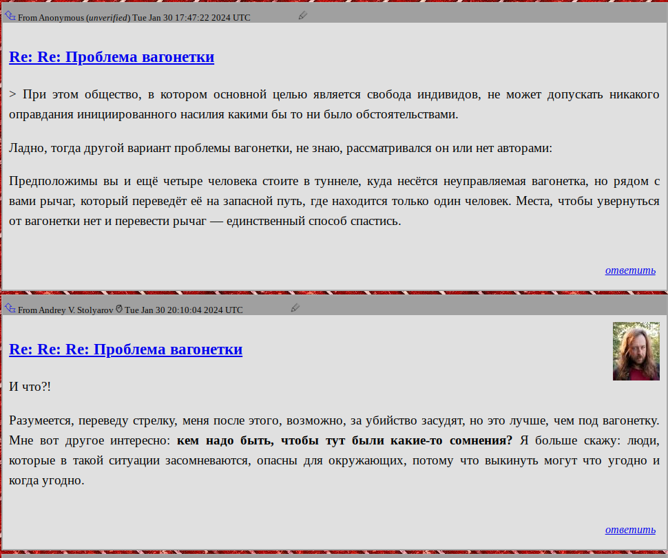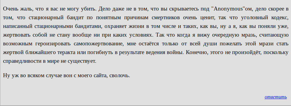 Анонимус умело затроллил и попустил Столярова. Оказывается, в случае угрозы своей жизни и здоровью тот вполне готов применить инициированное насилие: http://infoviolence.org/ru/vblog/video073.html