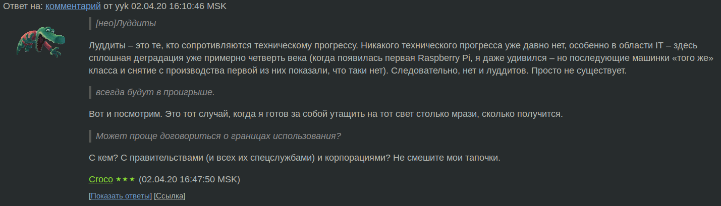 >>3405226 >Если можешь построить сложную и полезную йоба систему - типа госуслуг - то умный, если умеешь только пердолить консольку - то лох. Столяровской пастве этого объяснить будет сложно. Они думают, что тру-программисты это - хакеры-техногении, рыцари консоли и клавиатуры, а не автоматизаторы процессов реального мира и решальщики проблем бизнеса. Потому что Столяров сам этого не понимает, ему просто платили за то что он сотрясал воздух за государственный счет и никогда не работал в индустрии и вообще без понятия как она устроена. Оттуда у него и презрение к большинству инструментов, которые являются индустриальными стандартами. Сравнивать его с луддитами это оскорбление в сторону луддитов. Он скорее просто как старый тупой селюк, который из своей деревни никогда не выбирался и брюзжит на все что у него в деревне не было.