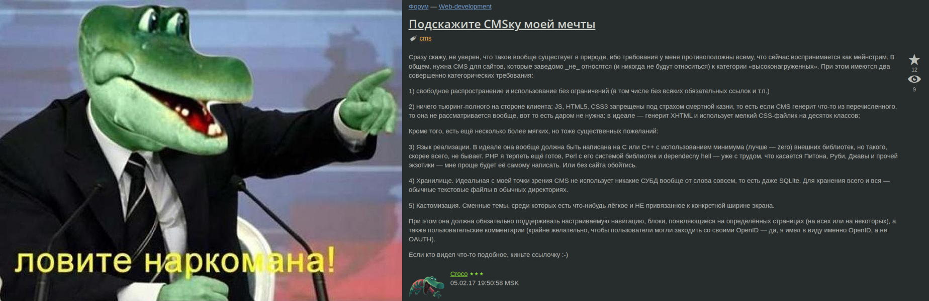 >>3374775 (OP) Сначала заинтересовался, хотел глянуть исходники, но, но как только в описании упомянули "CGI" и "your web server", интерес пропал. Вряд ли там CMS, скорее что-то уровня гостевухи на перле.