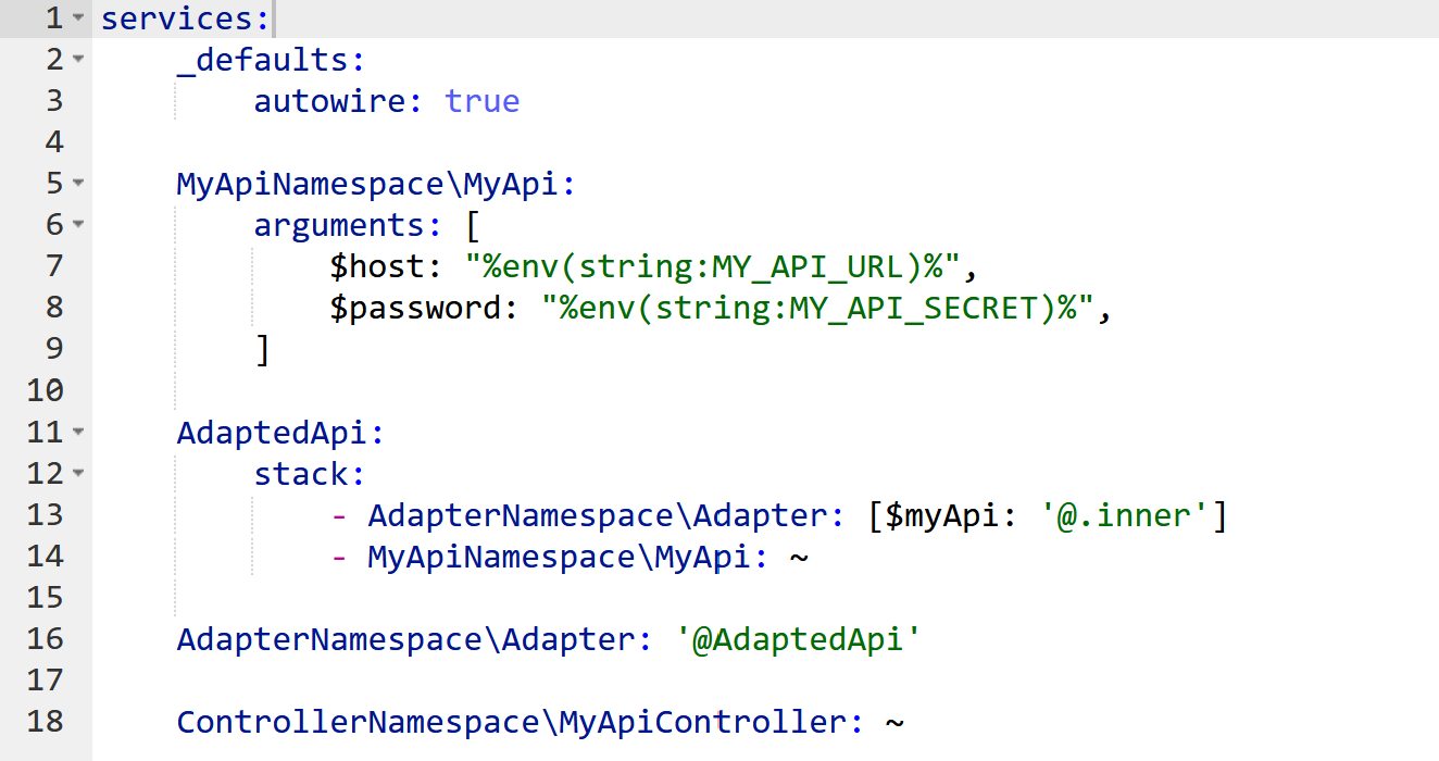 >>3392813 1) создай бандл для своего класса апи 2) создай конфиг для бандла 3) опционално можешь сделать пецепт для флекса чтобы он yml файл создавал с дефолтным конфигом при установке