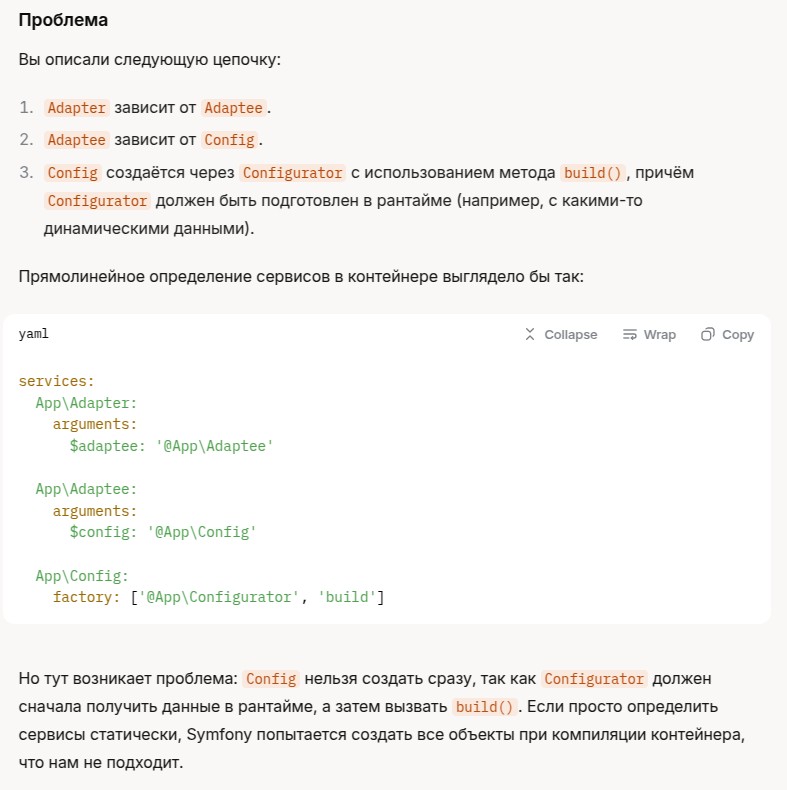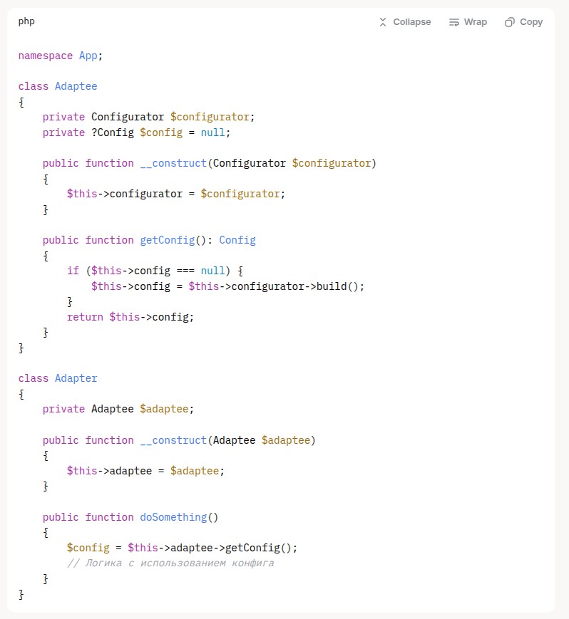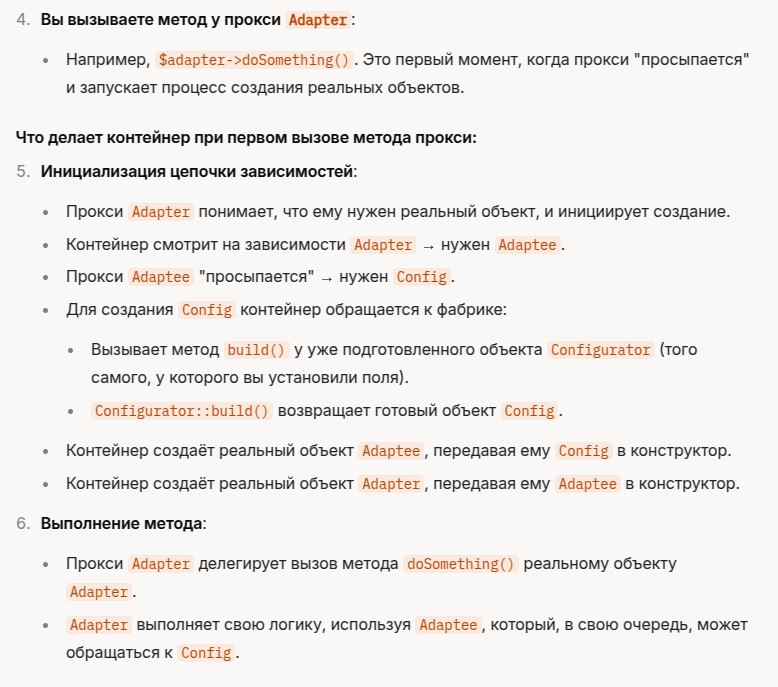 Допустим, у нас есть Adapter. Как известно, в конструктор адаптера необходимо передать объект Adaptee. В свою очередь, чтобы создать объект Adaptee, нам необходимо передать в него объект конфигурации Config. Но объект конфигурации сразу создать нельзя, нам сначала в рантайме нужно получить объект Configurator, вызвать у него определённые методы, передать в этим методы некоторые значения, а уже после этого последует вызов метода у Адаптера и только тогда, когда Адаптер будет использован, контейнер должен увидеть что объект Адаптера ещё не создан, контейнер возьмёт готовый объект конфигуратора, вызовет у него метод build() который вернёт объект Config, затем этот конфиг передаст в конструктор Adaptee, а затем Adaptee в Адаптер.