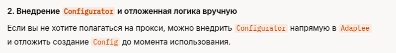 Смысл второго пункта в том, что ты делаешь обрётку над классом API, которая принимает не конфиг, а конфигуратор. А сам конфиг и объекта класса API создаётся только когда адаптер сделает вызов. Грубо говоря ты сам реализуешь лейзи лоадинг.