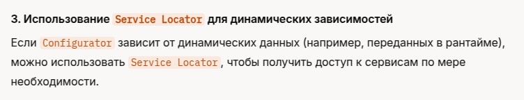 Во втором варианте ты опять написал хуйню. У тебя конфигратор-фабрика уже засунут внутрь, его не надо "получать". Ты сам должен при работе с классом знать что он не сконфигурирован и нужно дернуть его конфигуратор, чтобы он перешел в рабочее состояние. Что хуйня полная - классы должны создаваться сразу в рабочем состоянии.
