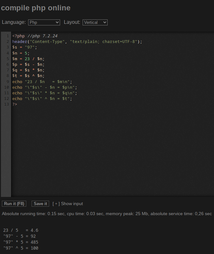 Зачем нужна подобная шиза? Последний пример особенно показателен - строка превращается в число, и затем к нему применяется операция битового XOR. Единственный ответ на предложение вычесть число из строки, умножить строку на число и тем более использовать низкоуровневые системные битовые операции со строкой может быть только один - "Прими таблетки, шизик". При этом нет совершенно нет операции деления целого числа на целое число (в 7-й версии, через 10 лет после выхода языка, добавили костыль в виде функции intdiv). Совершенно наркоманский язык для укуренных наркоманов, в котором нет никакой логики.