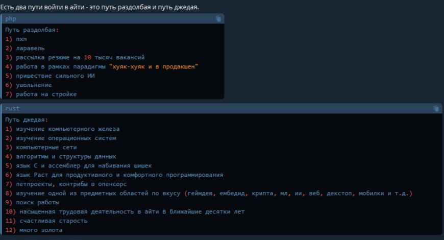 Но самый главный ред флаг - это байки про обучение. Я помогал вкатунам с обучением. И самая главная проблема - это как раз выдумать задачи и дать нагрузку. Ты просто, раз в день смотря один урок из какого-нибудь курса и делая дз на пару часов, за пол года пройдешь вообще все что только можно. Буквально все курсы, так или иначе доступные в рунете. За пол года нахуй. А тут охуительные трехлетние истории.