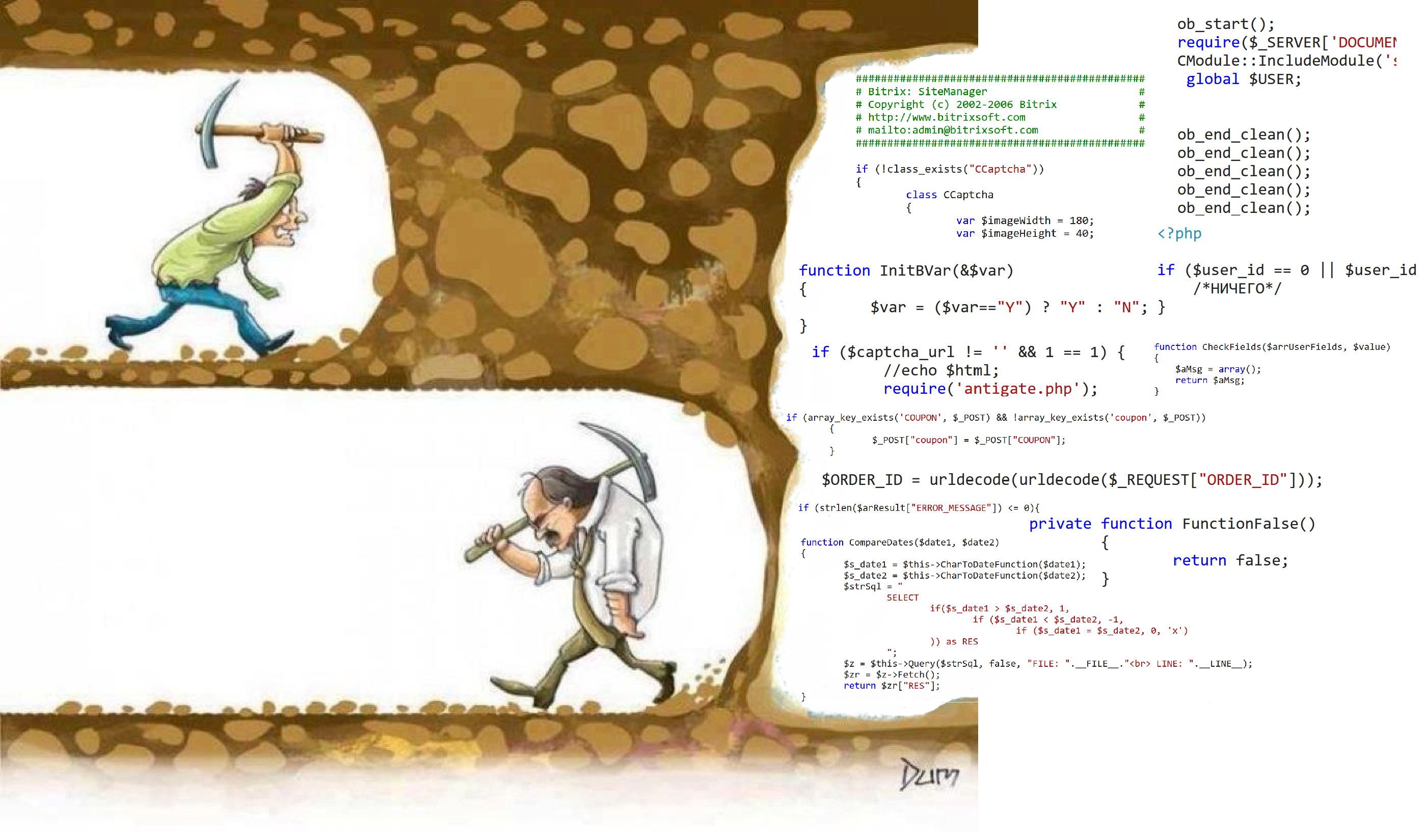 1) Половина функиональности делается из админки, при этом генерируются всякие файлы .section.php .left.menu.php и прочие. Компоненты с 100500 параметрами всталяются мышкой. У тебя коммиты из автогенерировано мессива состоят, которое ревьювить смысла нет.