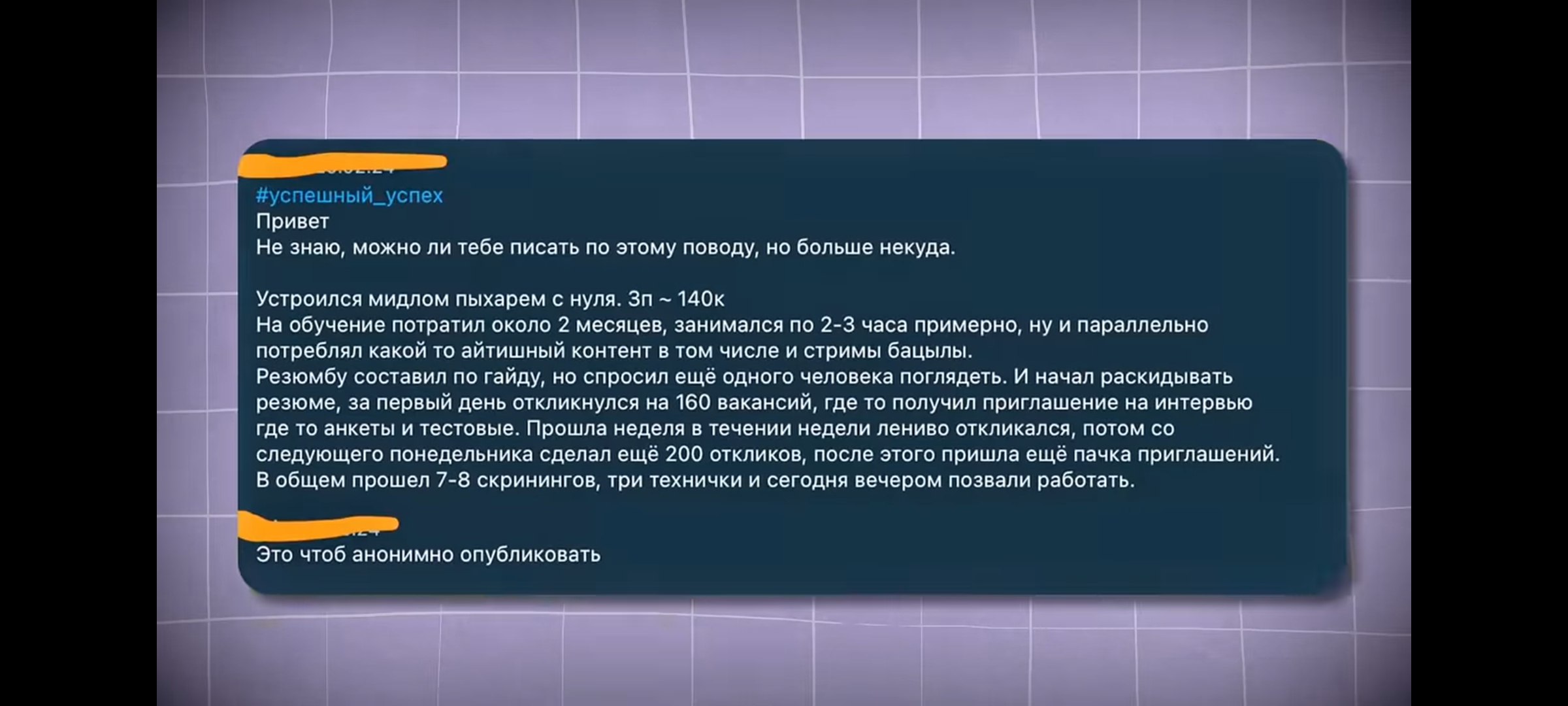 >>3421620 Не только хх, конечно. Но на хх самая большая активность у меня, поэтому её скинул! >>3421623 >опыт Опыт программирования у меня 3 года. Коммерческий опыт разработки - ноль, работы нет. >почему ты отказываешься Хм, даже не знаю. Наверное 3 месяца за спасибо работать не хочется? Понимаю, безумная идея, но рабство (незаконное, кстати) звучит не очень заманчиво. >тебя бы заметили Или не заметили. Или заметили и не взяли. Я и так снизил свои зарплатные ожидания до самого минимума, буквально до 20 тысяч (рублей в месяц xD) за полный рабочий день. Если it настолько мёртвое, что даже такие копейки тут платить никто не может, то я лучше буду кодить для души, а работать по нужде пойду в любое другое место, когда прижмёт. На заводе никто не предложит 3 месяца у станка стоять "за опыт". Тем более за теневой опыт (напоминаю, бесплатные стажировки в нашей стране нелегальны, в трудовую книжку тебе это никто опытом не запишет, а даже если выбьешь ГПХ, то опять же, на рынке труда подобный опыт сродни отсутствию) >нихуя не делаешь Неправда, я ежедневно продолжаю заниматься. Нагрузки мне хватает, я её самостоятельно могу организовывать, без лишних начальников. От начальства мне деньги нужны, а не опыт их. >не на удалённые Я живу в пгт, тут нет работы в офисе, а переезжать пока не могу. >>3421644 Увы, ты прав. В собственное оправдание скажу, что имею не совсем типичную историю вката, по сути у меня был офер изначальный, но он сорвался из-за событий трехлетней давности, теперь вот так и сижу не у дел.