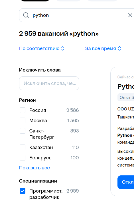 2) Убираем пункт "Искать в описании вакансии" - питон часто упоминается, как вспомогательный язык стека.