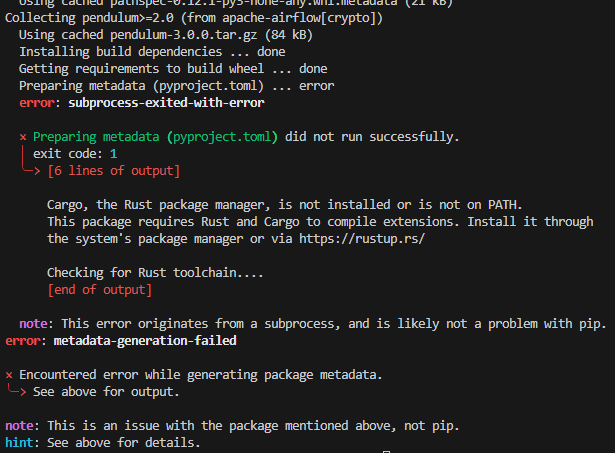 Сап, при установке либы для airflow вылазит пик1. Почитал в инете, все сводится к установке раста. Это серьезно единственный вариант? В одно сообщении на SO сказали, что pip на какой-то версии переехал на раст, это правда (ничего в гугле про это не нашел больше)?