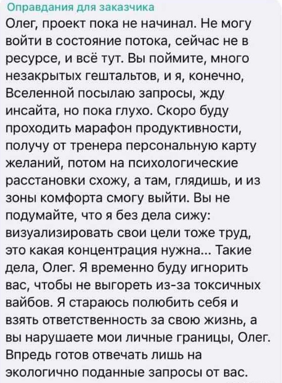 Есть разница между нихуя не деланьем и личными границами. Если первое я и сам осуждаю, то когда происходит второе, то лично у меня это вызывает уважение. Бизнес не платит тебе за то чтобы ты волновался, подрывался или работал в выходные. Мне на одной работе сказали: "Давай график дежурств сделаем на зимнии каникулы, чтобы если что тебе позвонили". Ну я, по гайдам Хованского и его историями про суботник до последнего говорил: "Хорошо, давай, подорвусь по возможности". В итоге трубку я не брал и нихуя мне не сделали за это. Аналогичные случаи были и на других работах.