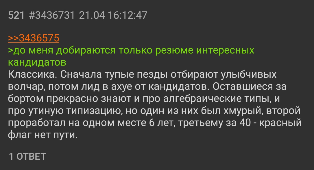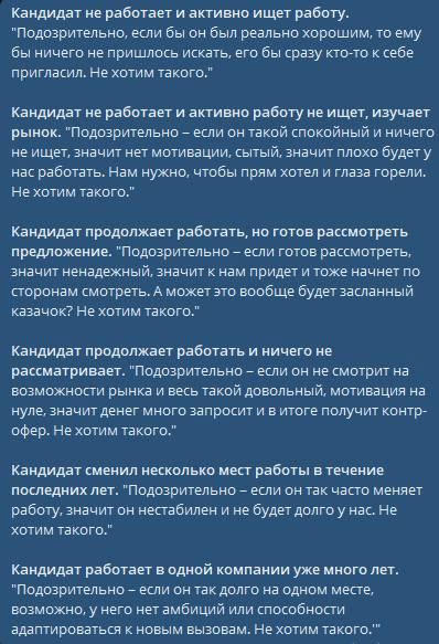 >>3430833 Какое нахуй негласное правило? Из-за такой хуйни завернули = и нахуй тогда не нужен был сотрудник или там очередь, какая разница по какой причине там привиделось что-то идиоту, сходу понятно что денег не дадут, вакансию закрывать не нужно, а значит и нахуй туда идти