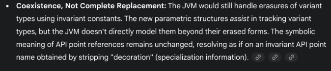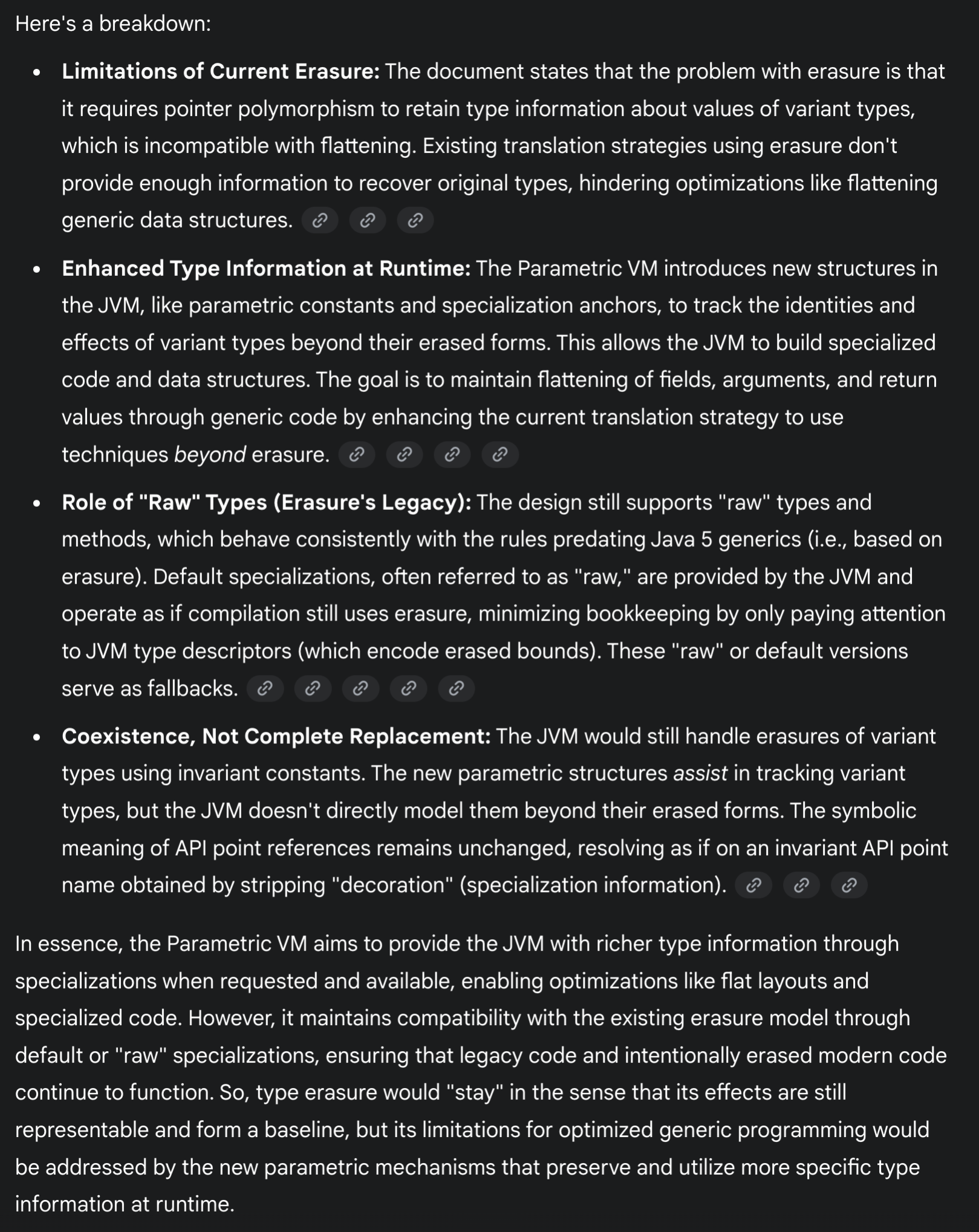 >>3468651 Это заголовок статьи на 41 страницу https://cr.openjdk.org/~jrose/values/parametric-vm.pdf я честно ебал в рот эти маняфантазии читать, который уже лет 10 реализовать не могут и все фантазируют, фантазируют и фантазируют. Прочти за меня и найди конкретную фразу, где говорится, что стирание типов уйдет, а не добавят банальную хуйню, типа refiend из котлина. Просто открою секрет, ты и сейчас можешь это все сделать и даже неявно.