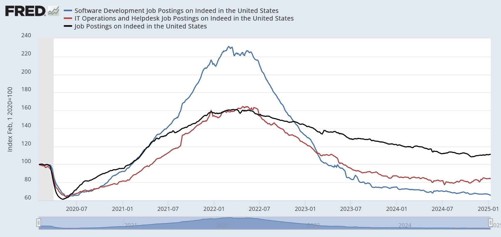 >>3336180 (OP) Пузырь ИТ несколько лет назад был свзяан с ковидом и дешевыми кредитами за счет низкой ключевой ставки ФРС. Конкретно в РФ половина вакансий была на западные компании, которые пропали после известных событий. Сейчас и внутренние вакансии сокращаются в связи с известными событиями в экономике. https://www.cnews.ru/news/top/2025-01-18_sber_massovo_sokrashchaet_sotrudnikov
