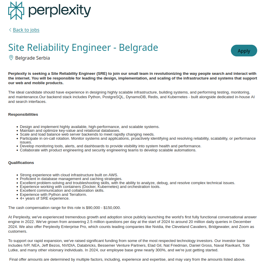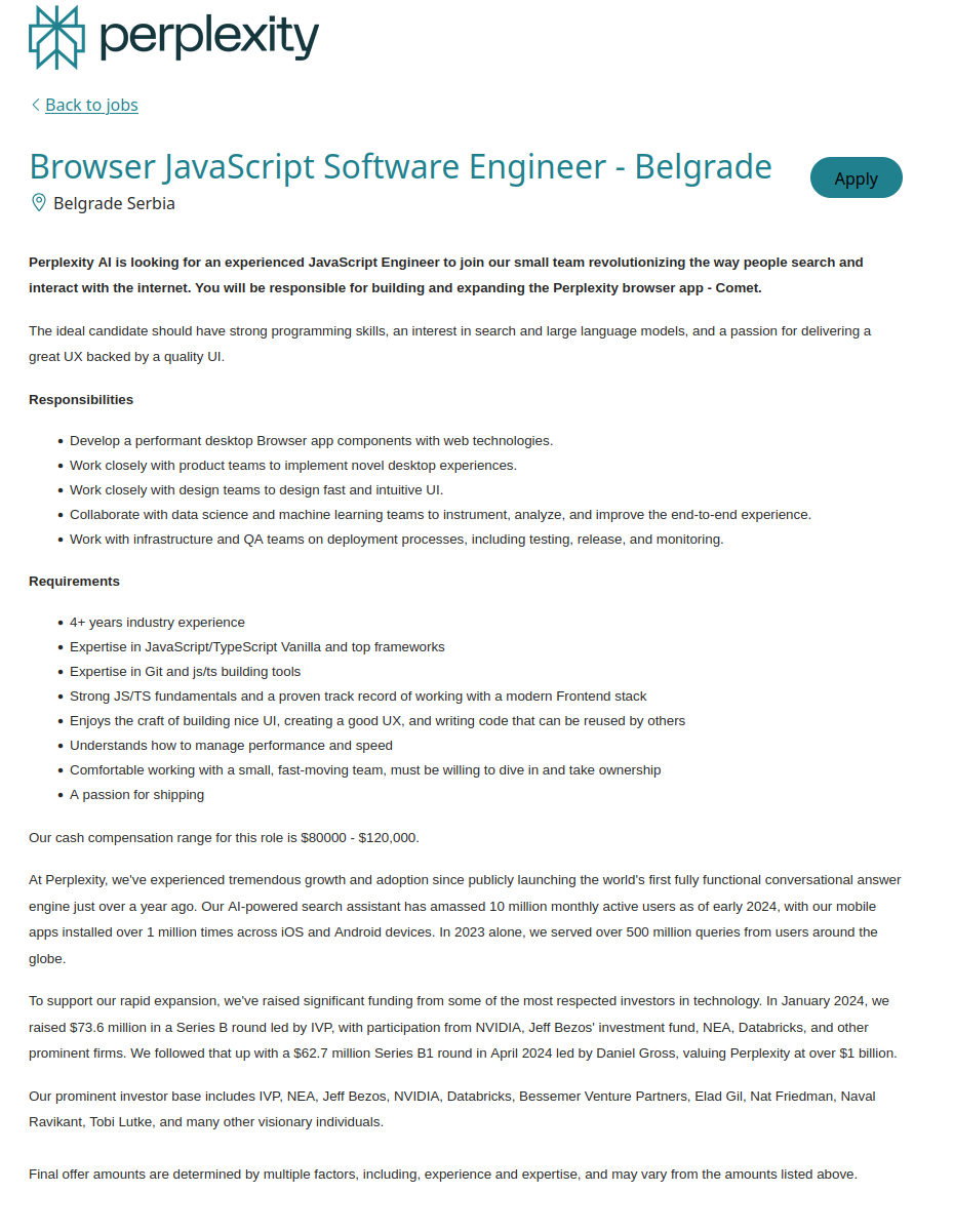 >>3469126 >Заработать на две хаты в Москве, работая в сербском офисе perplexity, сильно легче Все равно, что пытаться залететь в JaneStreet на OCaml или в Google Маунтин Вью. Чел, туда буквально отбирают лучших из лучших. Типичный гребец и перекладыватель жысонов в лучшем случае осядет где-нибудь в Германии на 50к евро в год до вычета налогов. Почитай требования и стек твоего перплексити. Там нужны исследователи и топовые разработчики в области AI