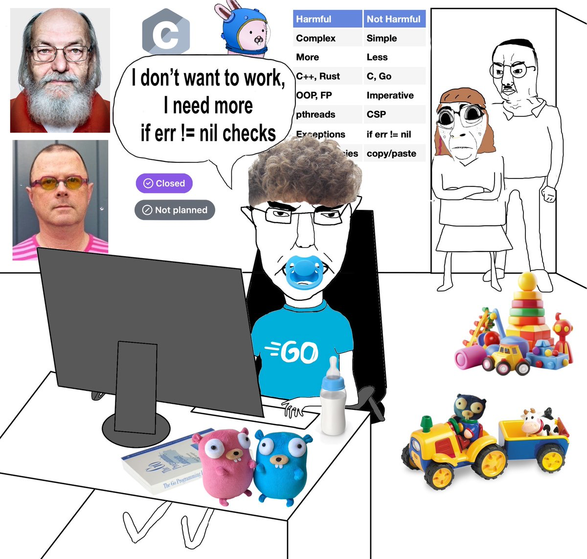 >>3470168 >Как это выглядело? ЧТо конкретно пытались протащить скуфидлы на проект с упругими зумерами? Я дохуя чего наблюдал. Я уже потерял счёт людям, которые пишут на JavaScript как на Java, или на питоне как на JavaScript, забывая, что это разные языки. Помню, я написал статью целую, где конструктивно обосрал питон, на что прибежали молодые утята и начали мне втирать про то, что лучше ЯП в мире не бывает, "ты просто не понимаешь, всё логично" — как ты думаешь, во что они превратятся через 5-10 лет? Прибежали хаскелисты, начали рассказывать про "хаскель — это просто и понятно", привели три строчки кода, в которых немедленно ошиблись, и при компиляции эти три строчки выдавали три экрана ошибок компиляции. Я будто какой-то ящик пандоры вскрыл своей статьей.
