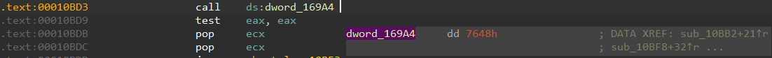 Аида выдает такую инструкцию: call ds:dword_169A4 ссылается она на это: .rdata:000169A4 dword_169A4 dd 7648h ; DATA XREF: sub_10BB2+21↑r