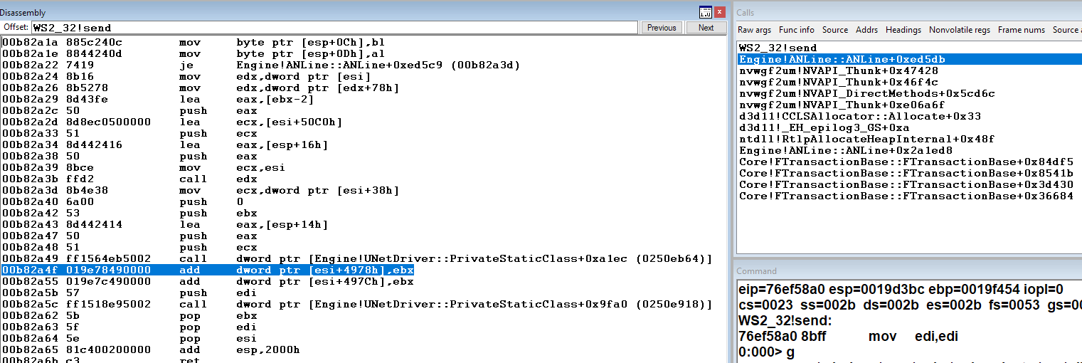 Даблкликаю в колл стеке по второй строке сверху, ожидаю увидеть ПРОЛОГ функции, которая вызовет call WS2_32!send вижу середину какой-то функции, которая перед ретурном вызывает какую-то хуйню вместо send В чем я не прав? как это работает?