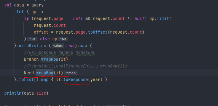>>3263846 Так, я хоть что то смог понять, но не уверен, опчик: Во 1. WrapRow конвертит из модели дб в котлин объект и гдето там хз где сохраняет. Во 2. Почему 5 селектов? Эта ормка очень сломанная и впринципе на ней нельзя писать еще. Она мне недавно базу данных поломала тем, что все данные обновила, хотя был запрос на upsert. В 3. Он оборачивает старые запросы (branch) в котлин объекты, кидает в кеш, а потом еще новые оборачивает в котлин объекты, потом кидает из хз_какой_тип в list, а потом еще мапает в хз что это просто. ПС. Есть лучшая альтернатива и не баганная - ktorm