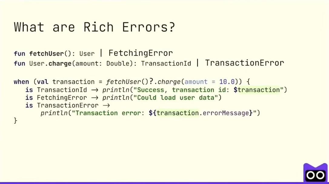 >>3396715 >А как ты будешь различать какие ошибки возрвращает метод? Как деды завещали: BaseError, от него наследуем FooError и BarError. В обработчике: when(x) и погнали, все что можно обрабатываем, остальное пробрасываем выше/игнорируем. В общем-то ничем принципиально от обработки эксепшенов не отличается.