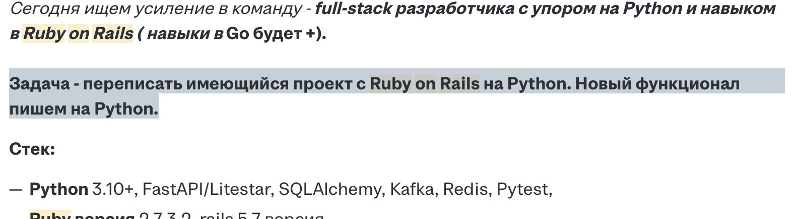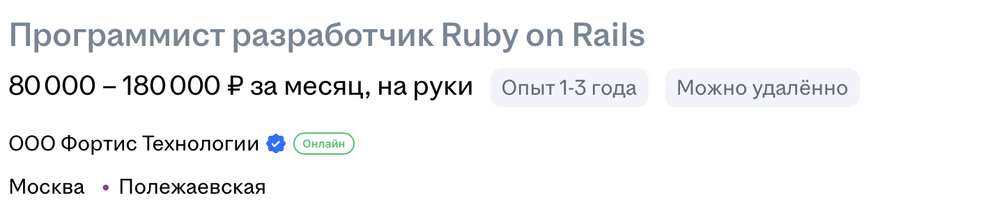 Я аналитик по профессии, и я смертельно от этого заебался, от этих бесконечных ТЗ и созвонов уже блевать тянет. С руби я знаком давно, использовал его несколько лет периодически для какой-то мелкой рутины, писал скрипты для своих нужд, делал ботов тг. Очень нравится язык за простоту и выразительность. Мысли о вкате в руби уже многие годы не покидают меня, была даже одна попытка (неуспешная), где я сидел джунишкой и в соло пилил веб-сайт, обслуживая бековую и фронтовую часть (собственно от груза ответственности и необходимости быть фуллстеком я и посыпался тогда). Сейчас смотрю на вакансии - как будто стало хуже, в целом их меньше, везде вижу ПОЖЕЛАНИЕ быть фуллстеком, чтобы ковырять всякие реакты параллельно бековой разработке. При этом ЗП чуть выше условного пиздониста и ощутимо ниже какого-нибудь гошника.